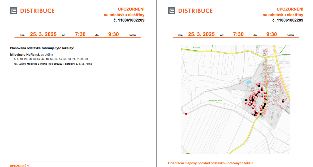 Dne 25.3.2025 od 7:30 do 09:30 bude v obci Milovice bude přerušena dodávka elektrické energie.