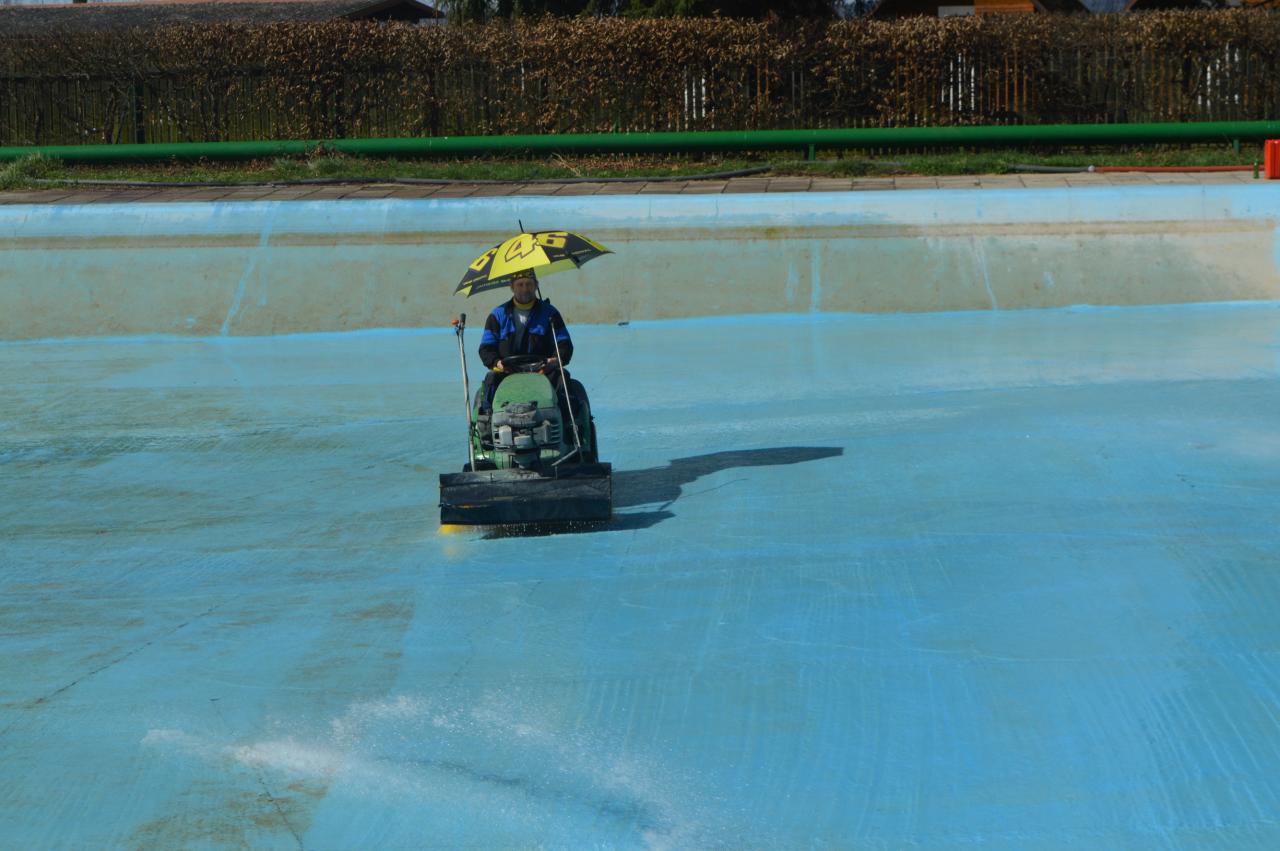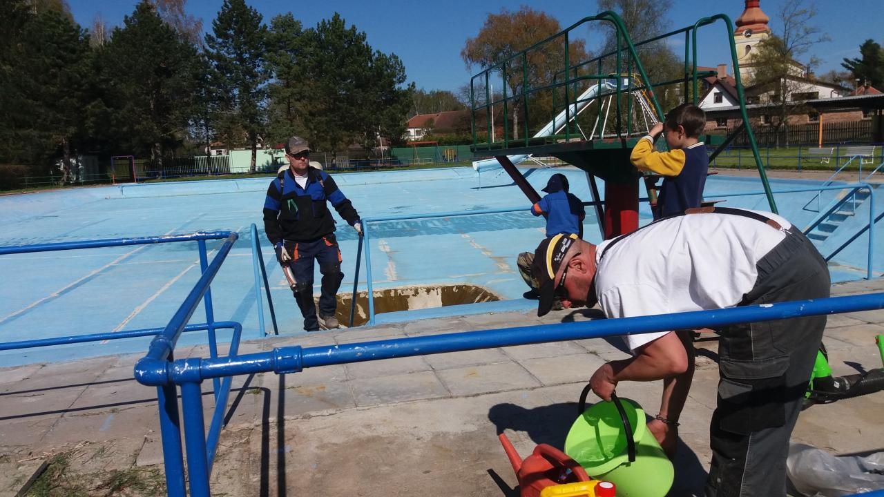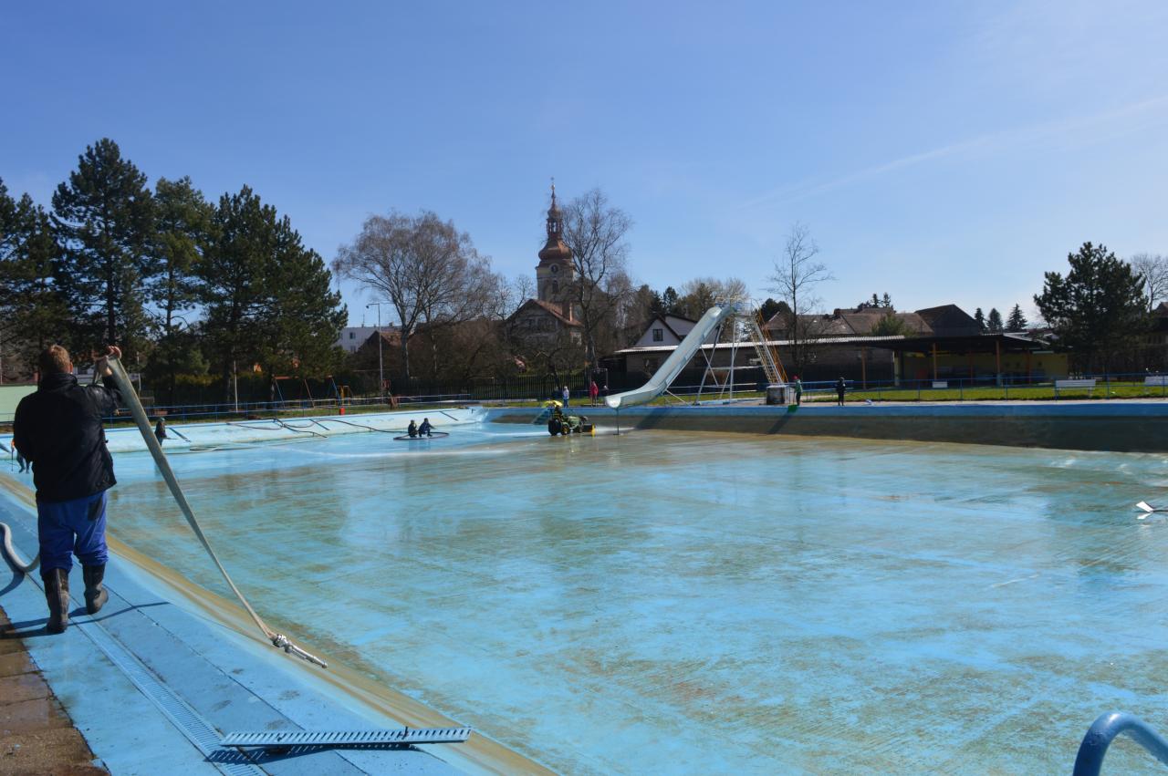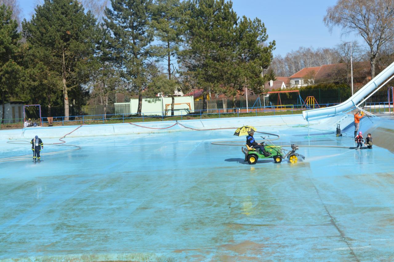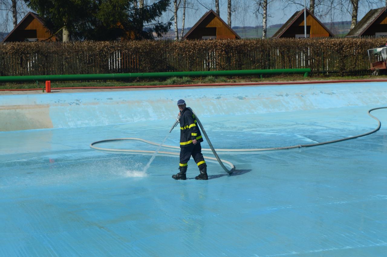 Mytí, savování a nátěr koupaliště v podání místních hasičů.