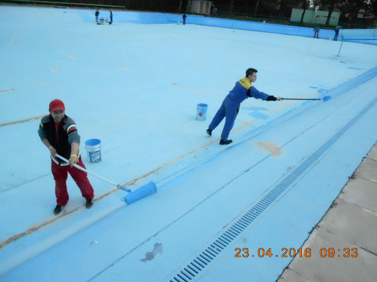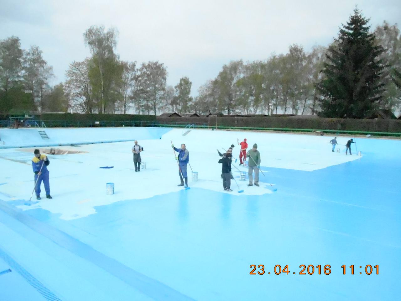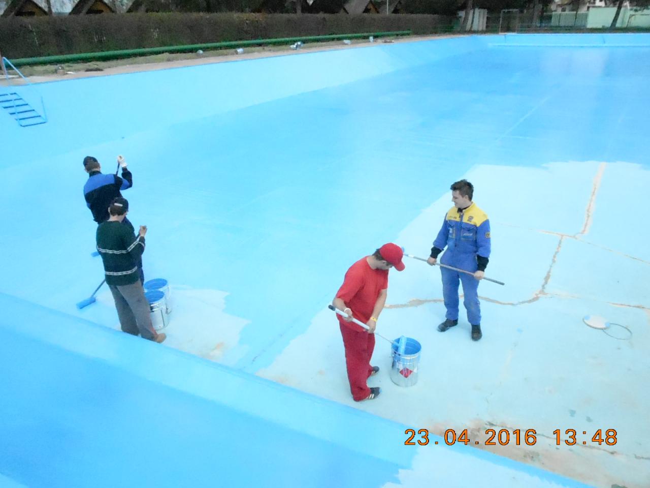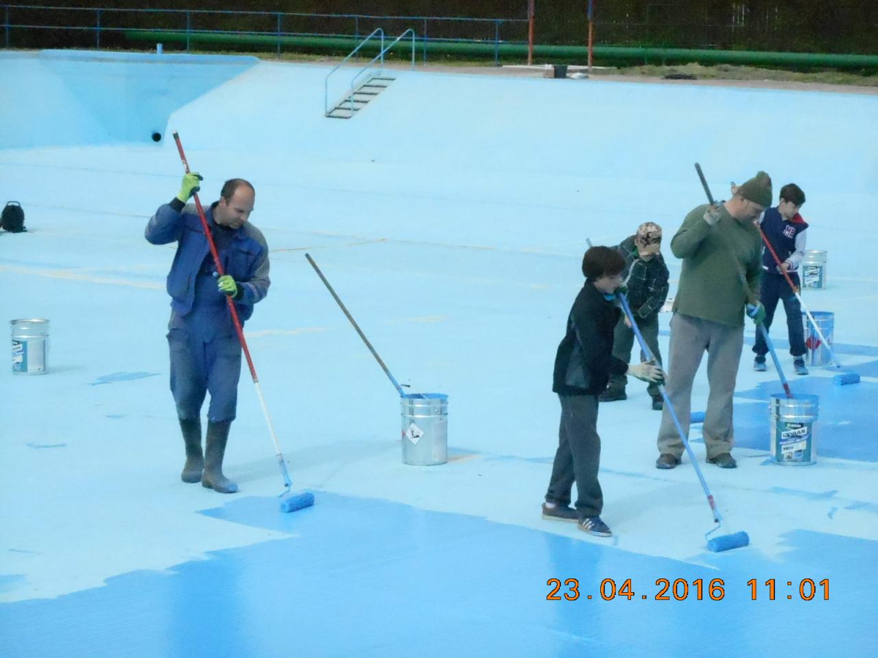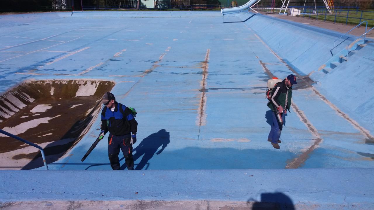 Mytí, savování a nátěr koupaliště v podání místních hasičů.