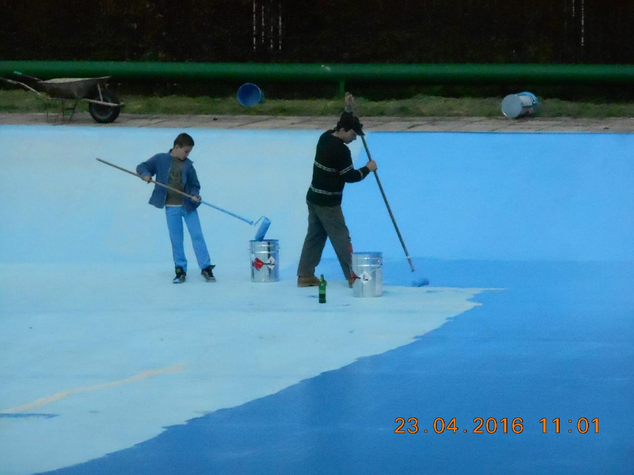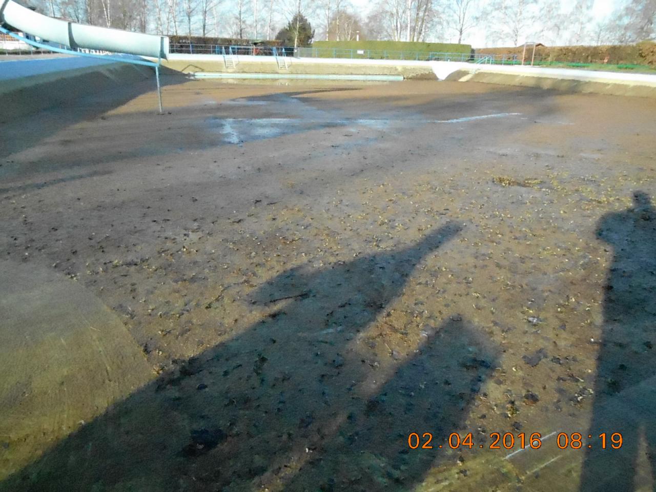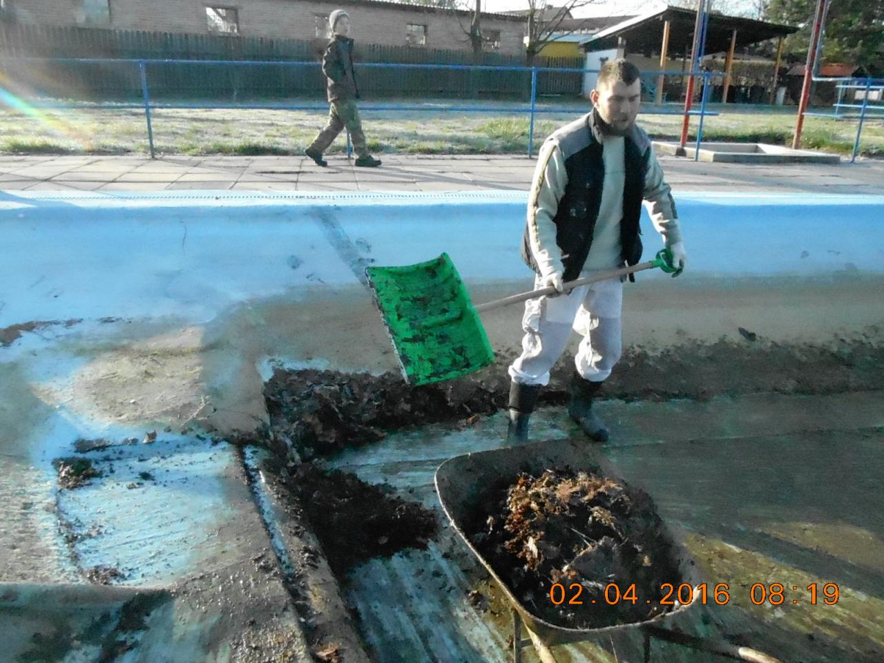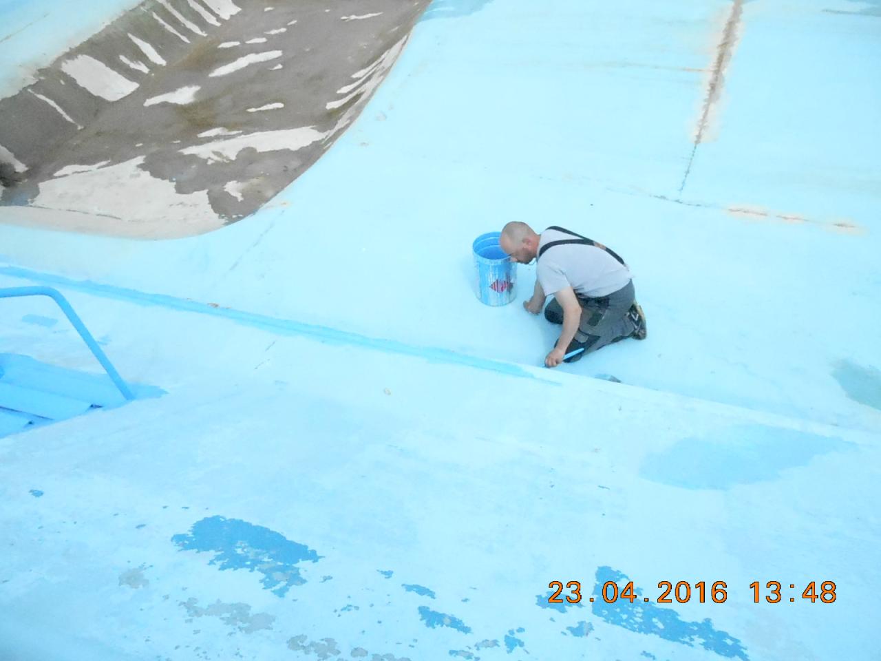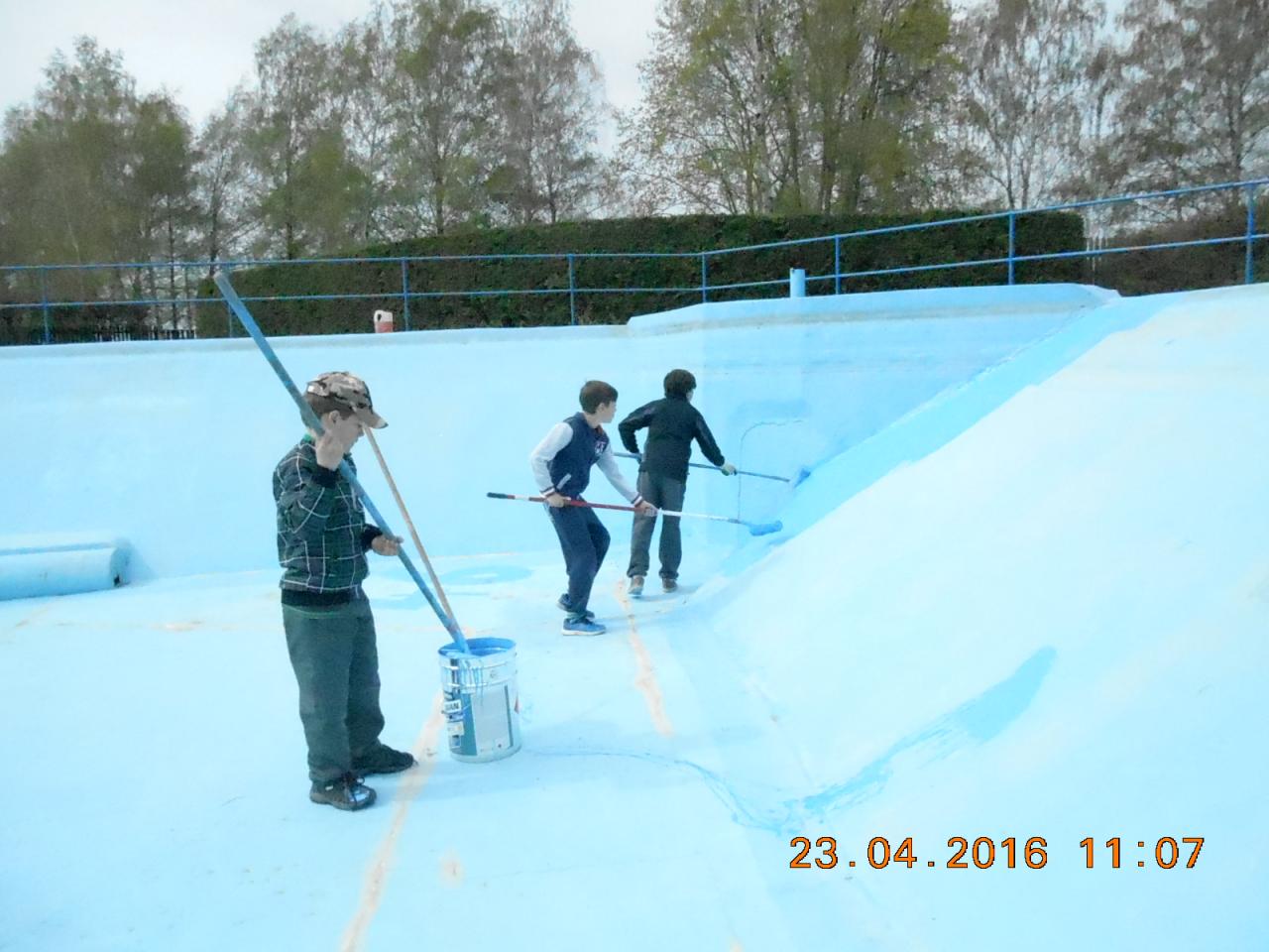 Mytí, savování a nátěr koupaliště v podání místních hasičů.