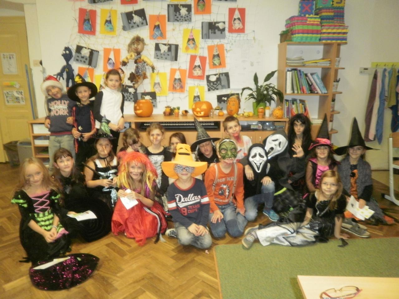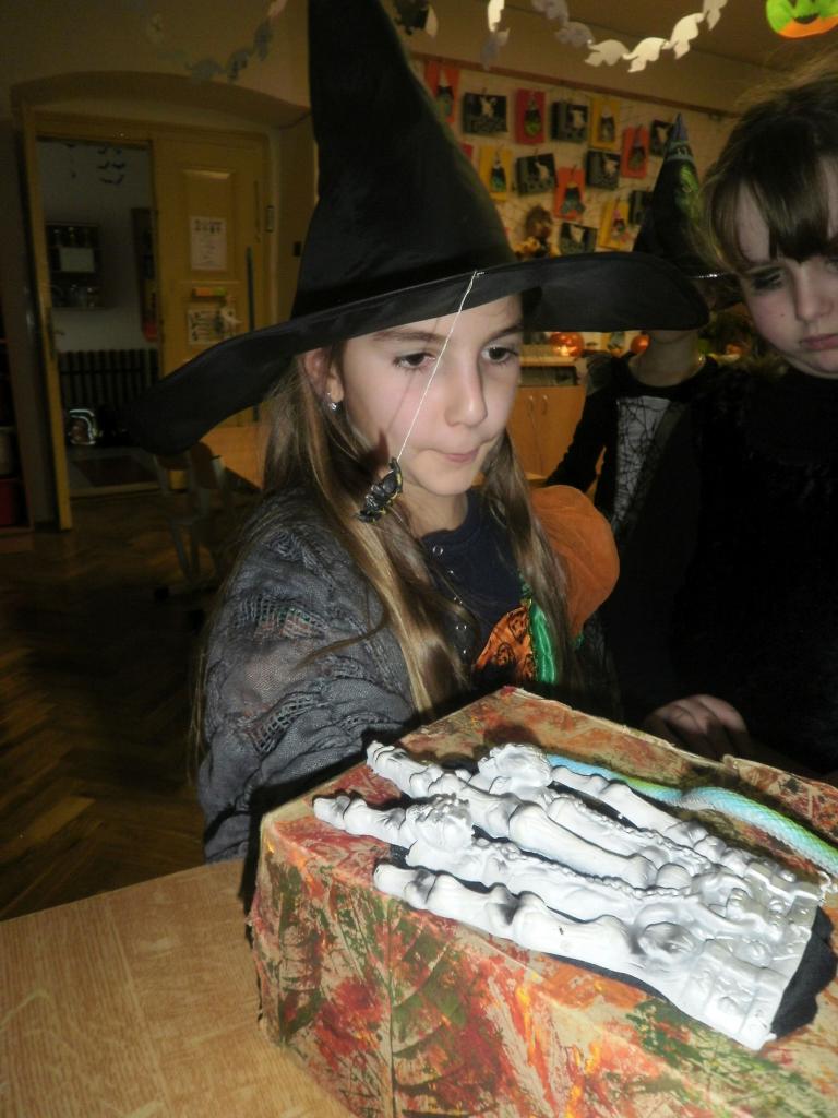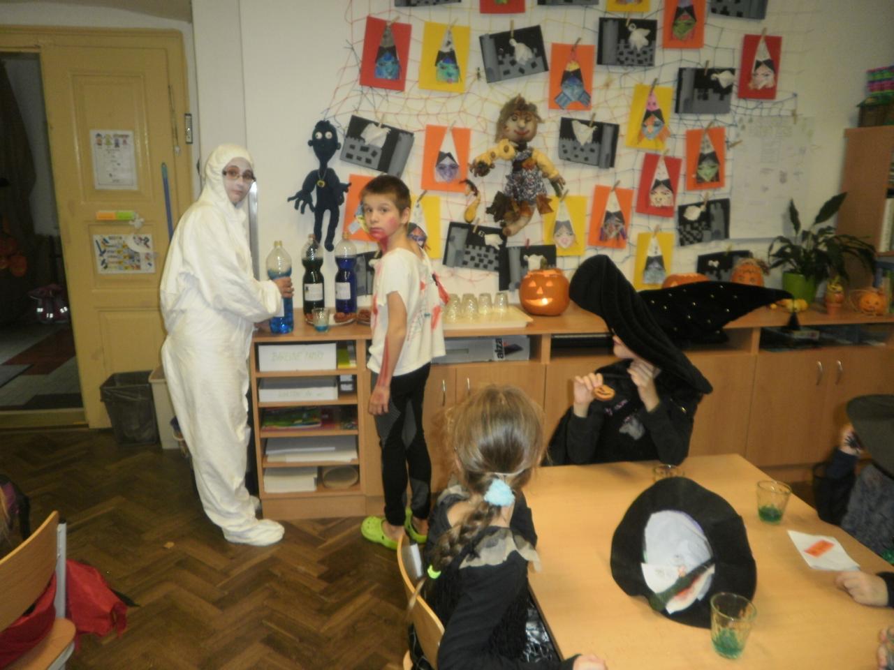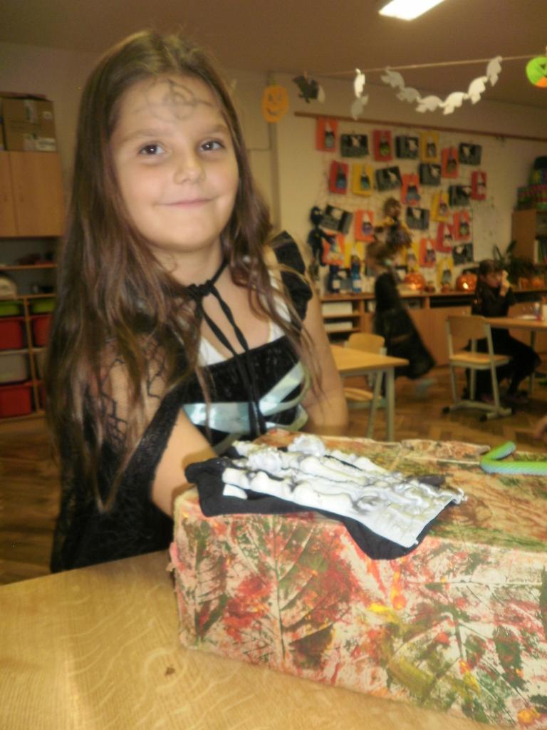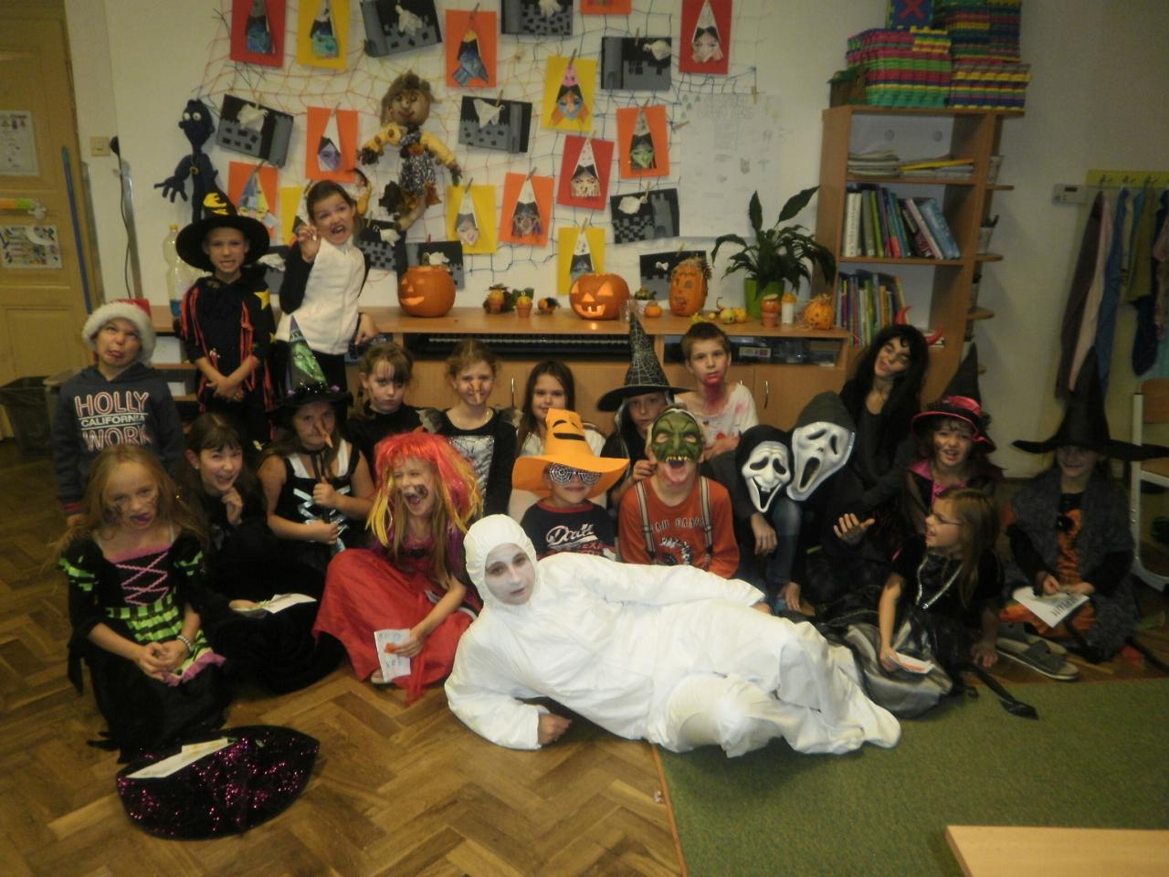 V úterý jsme si připomněli keltský svátek Halloween. I když v naší zemi není tradičním svátkem, odpoledne v maskách jsme si užili. Při vyprávění pověsti O Jackovi jsme se dozvěděli, jak tento svátek vznikl. Zabavili jsme se plněním různých úkolů. Hráli jsme dýňové kuželky, hadím jazykem namotávali bonbón do pusy, po překonání překážkové dráhy jsme svoji účast potvrdili krvavým podpisem, hledali jsme ptačí hlavu do kouzelného lektvaru a skládali puzzle. Strašidláckým hlasováním jsme vybrali Miss strašidlo. Nechybělo občerstvení v podobě upíří krve, pavoučí sliny a žabího lektvaru, doplněné dýňovými hlavičkami.