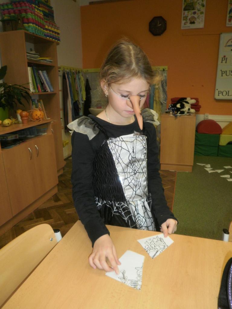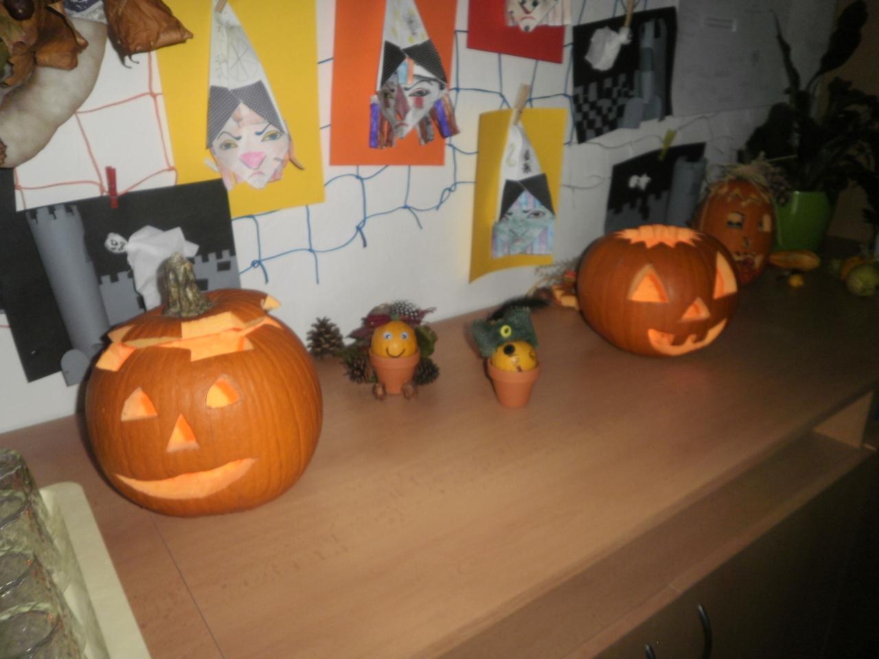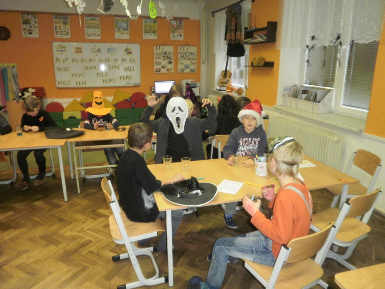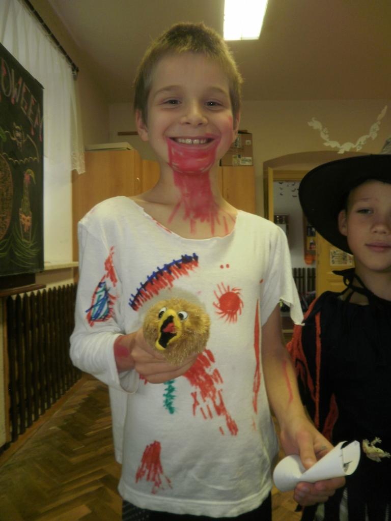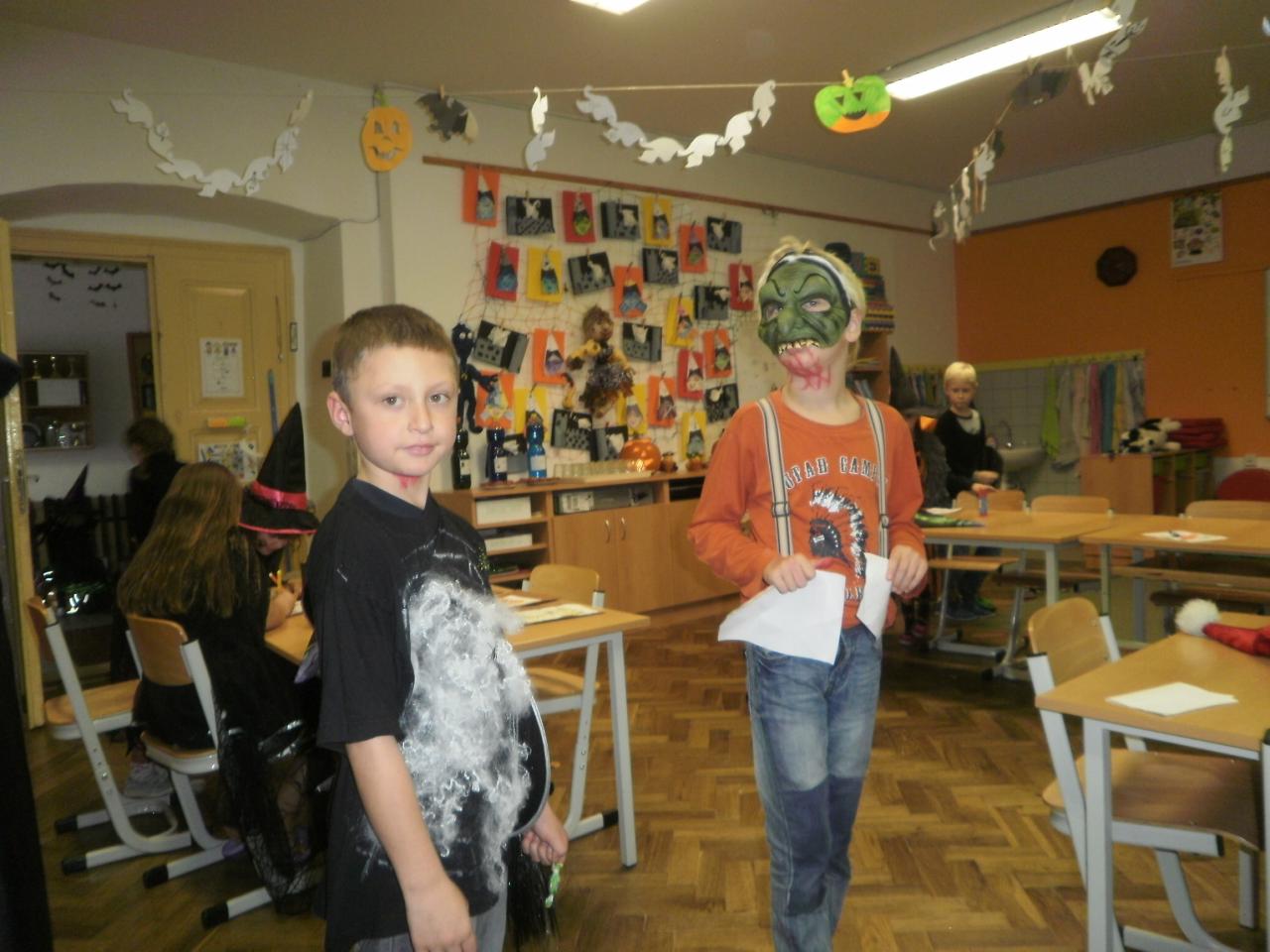 V úterý jsme si připomněli keltský svátek Halloween. I když v naší zemi není tradičním svátkem, odpoledne v maskách jsme si užili. Při vyprávění pověsti O Jackovi jsme se dozvěděli, jak tento svátek vznikl. Zabavili jsme se plněním různých úkolů. Hráli jsme dýňové kuželky, hadím jazykem namotávali bonbón do pusy, po překonání překážkové dráhy jsme svoji účast potvrdili krvavým podpisem, hledali jsme ptačí hlavu do kouzelného lektvaru a skládali puzzle. Strašidláckým hlasováním jsme vybrali Miss strašidlo. Nechybělo občerstvení v podobě upíří krve, pavoučí sliny a žabího lektvaru, doplněné dýňovými hlavičkami.