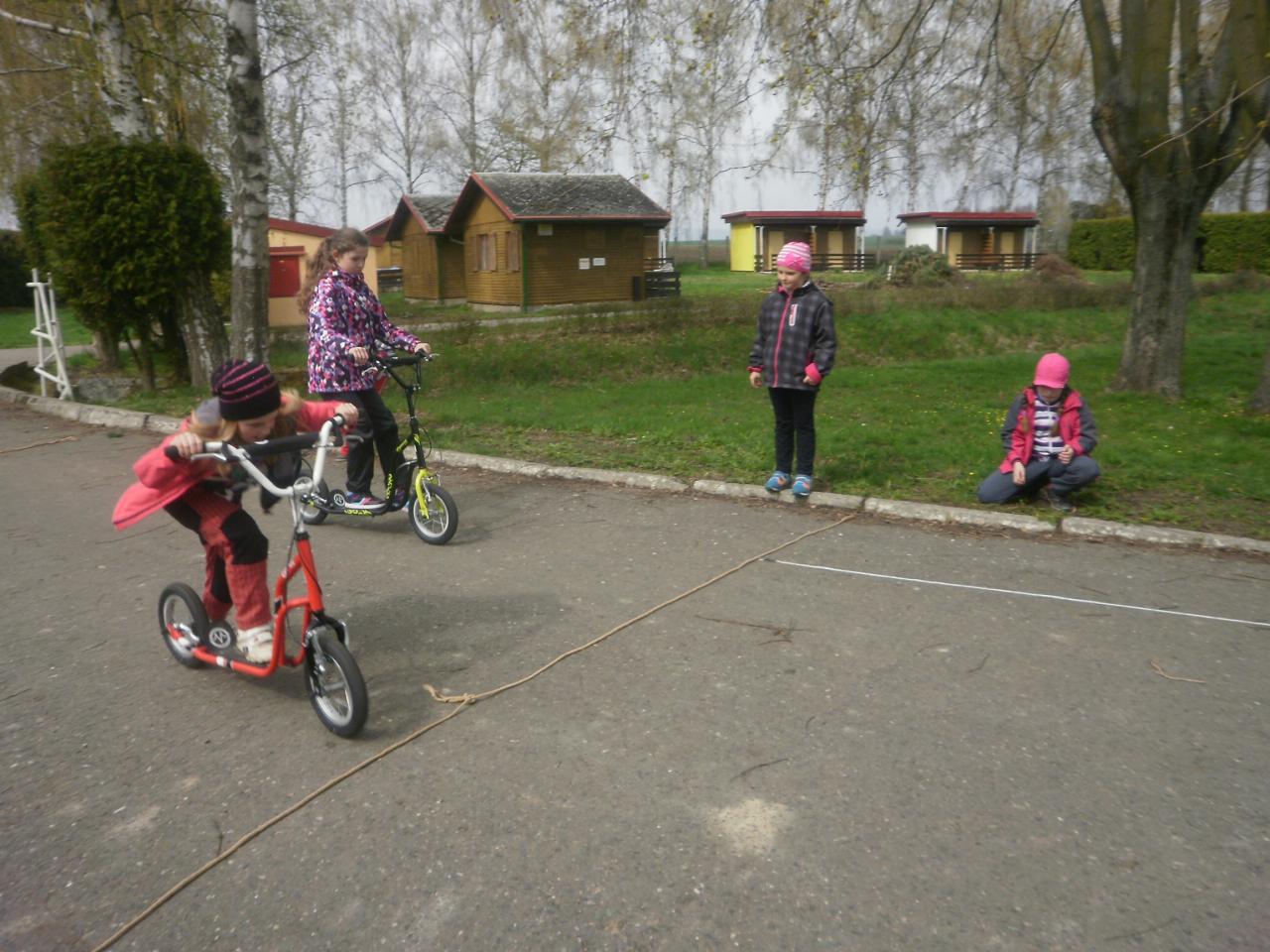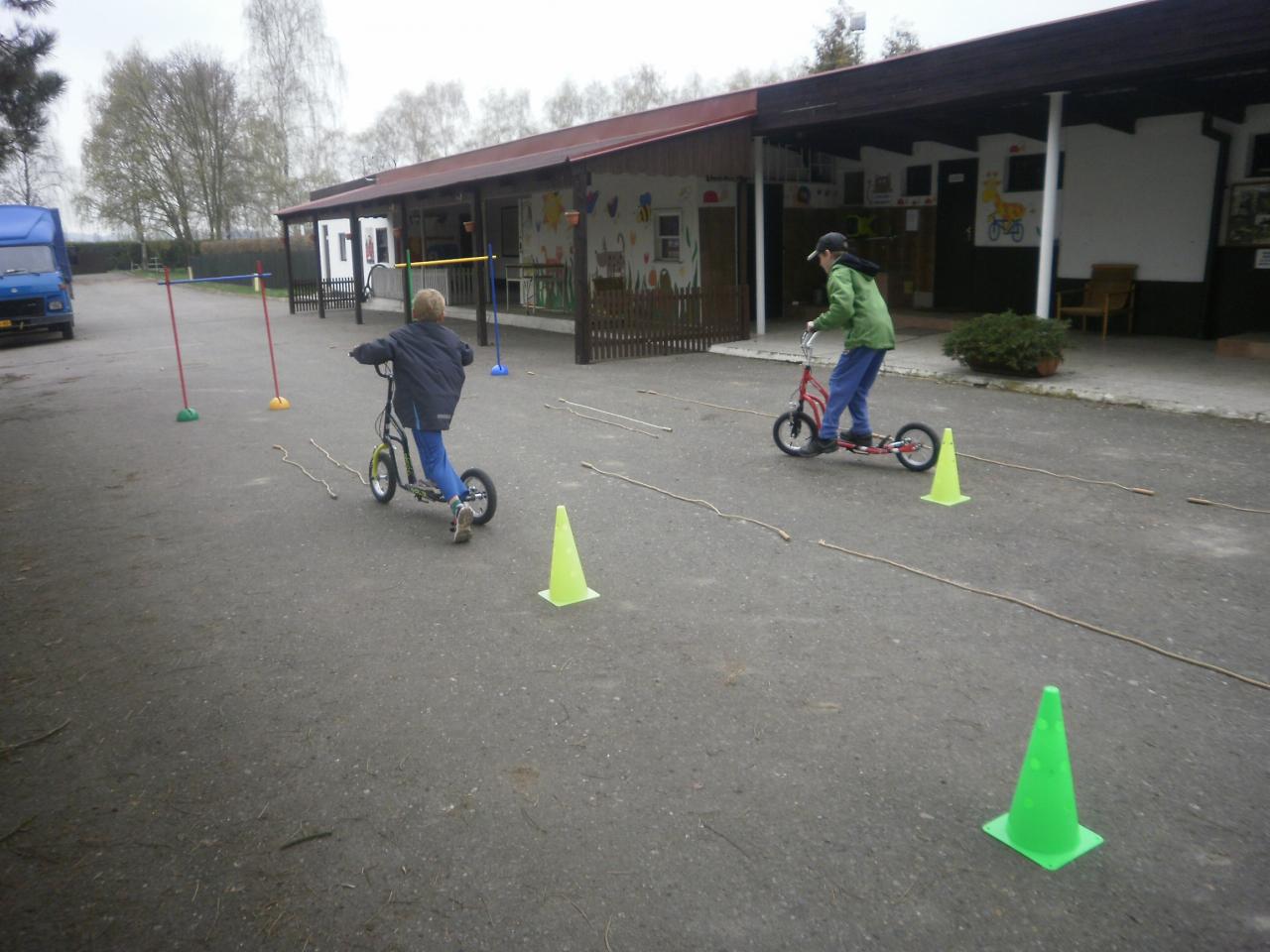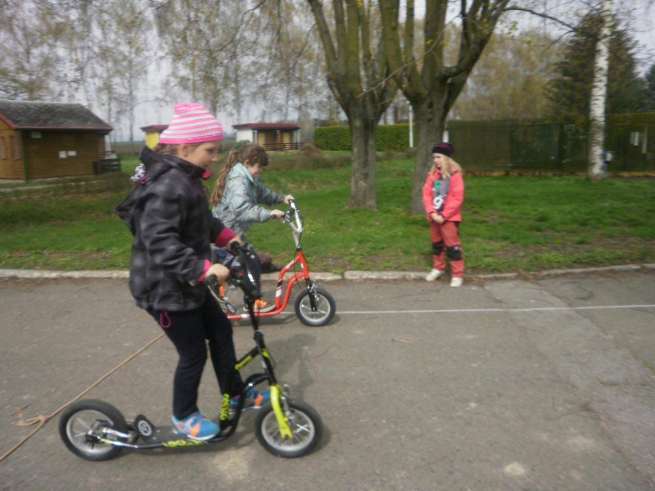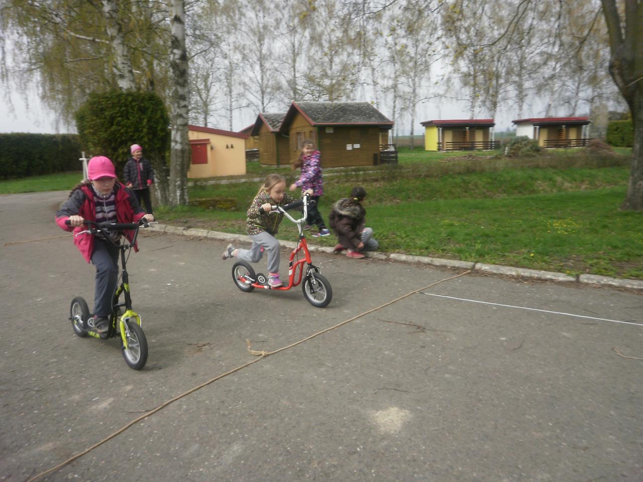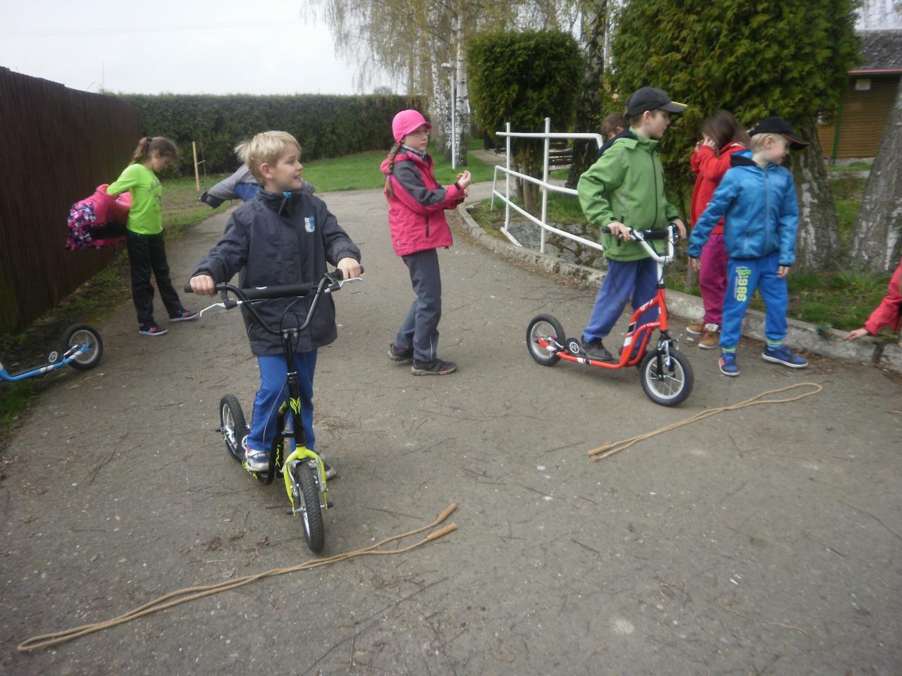 Díky panu Machkovi a dotačnímu programu Ústecké komunitní nadace jsme jako škola dostali dotaci na nákup sportovního vybavení. Tu jsme využili ke koupi tří koloběžek do školní družiny. Jen, co se udělalo hezky, uspořádali jsme koloběžkové závody. Soutěžili jsme v překážkové dráze a v krasojízdě do dálky.