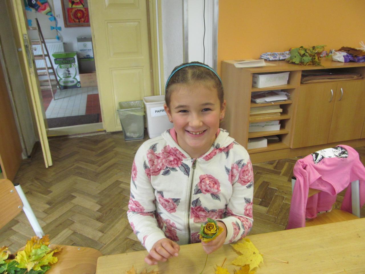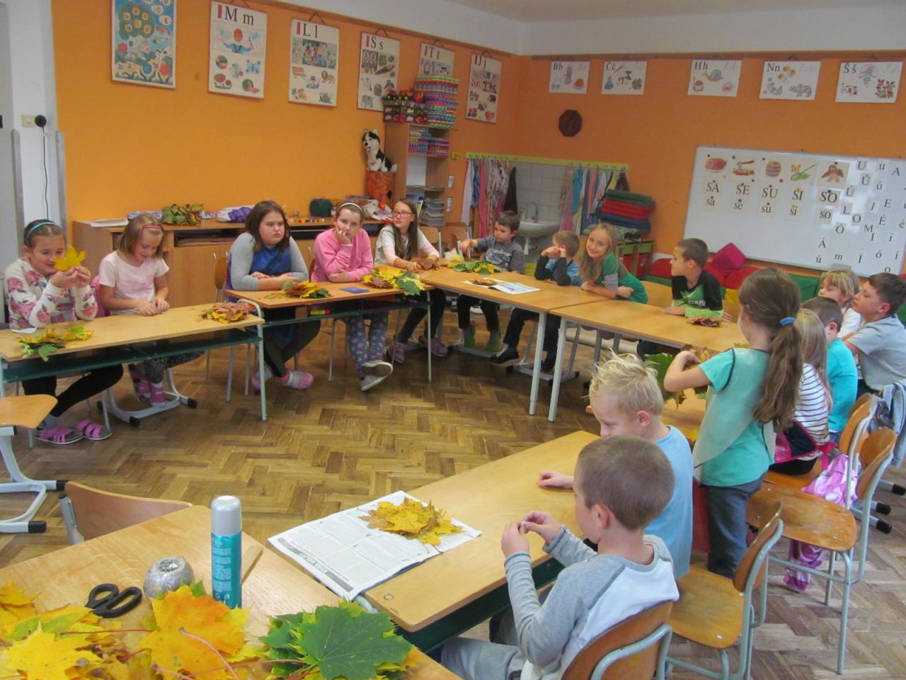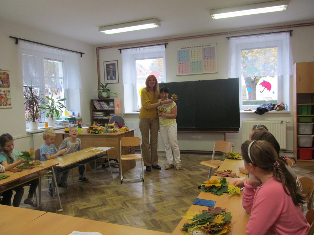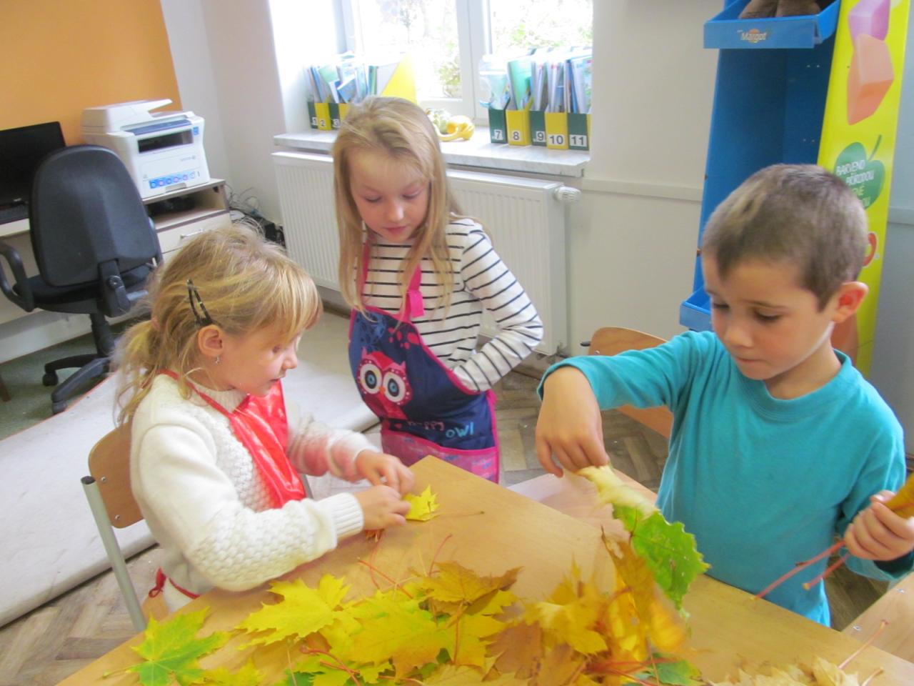 V rámci kroužku "Ruční práce" žáci vyráběli s paní Gembalovou z barevného podzimního listí kytice.