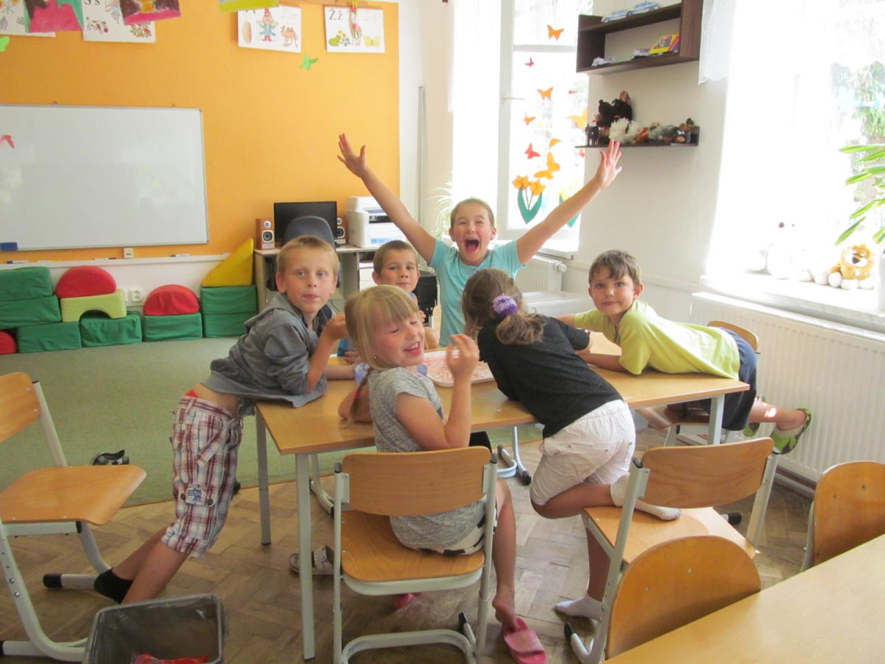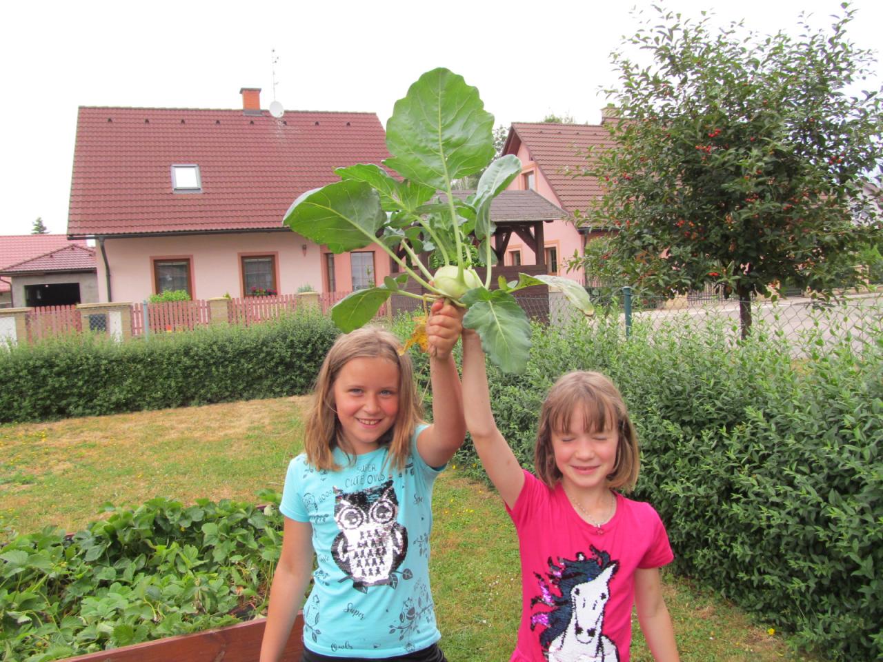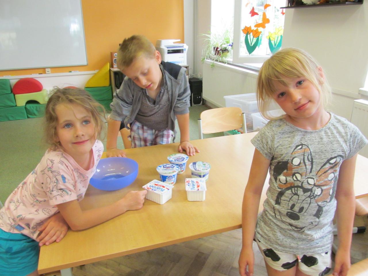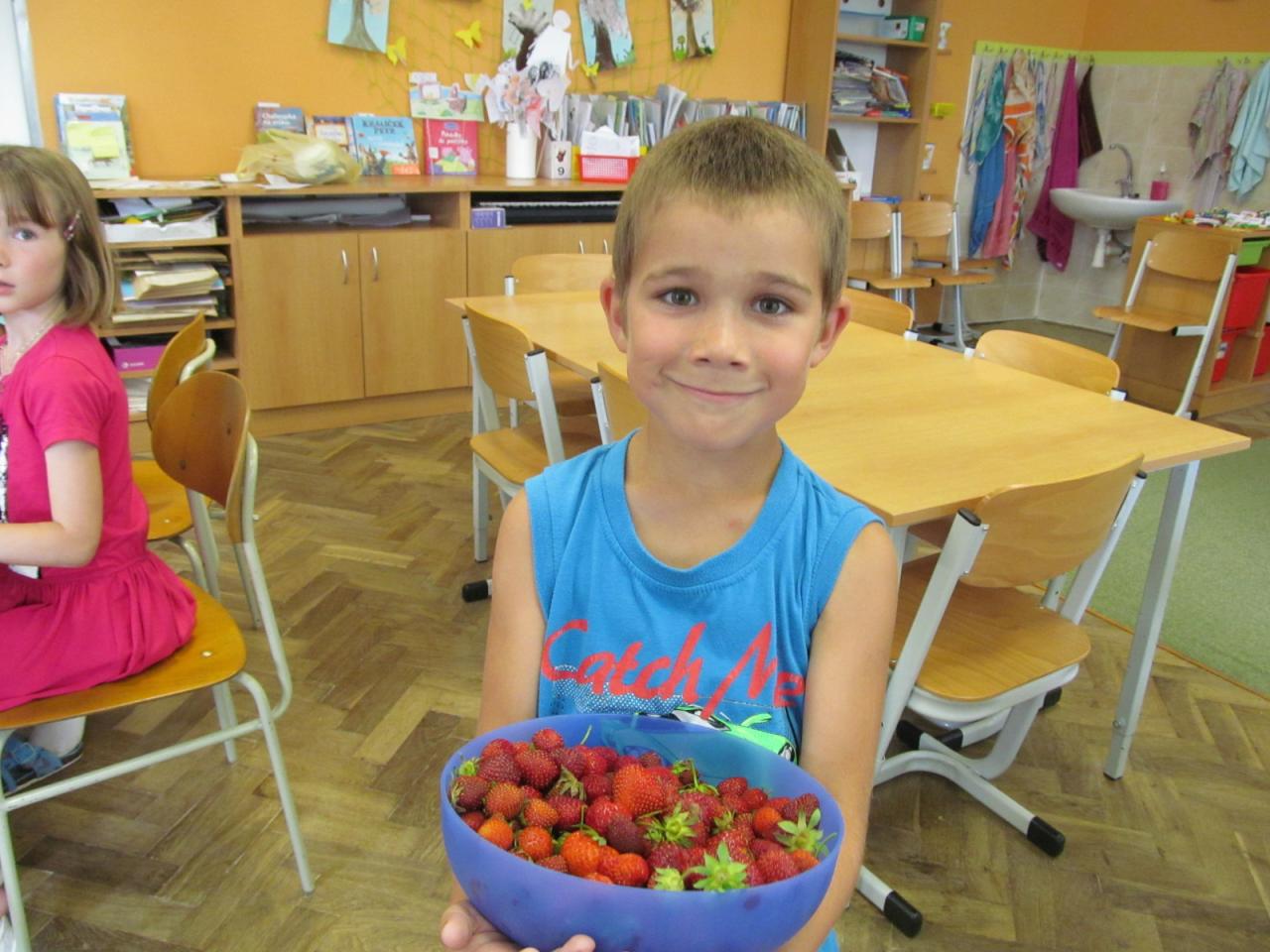 V odpolední družince děti sklízely ovoce a zeleninu. Protože se jim úroda povedla, rozhodli jsme se, že si vyrobíme jahodový dort. Dortík byl ze zakysané smetany, tvarohu a piškotů. Dětem se moc povedl a všem chutnal.
