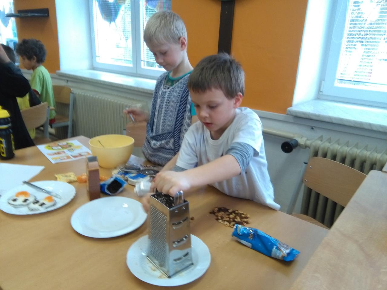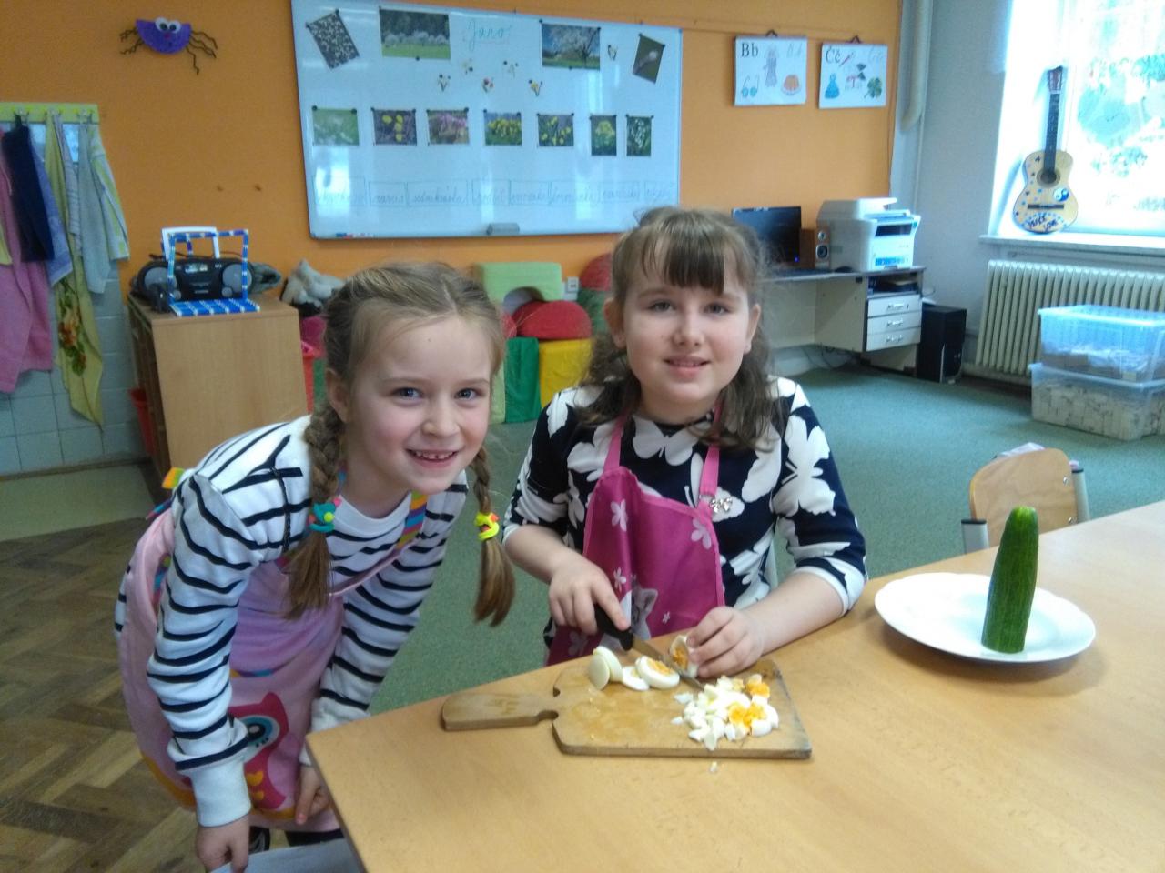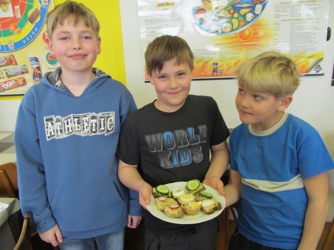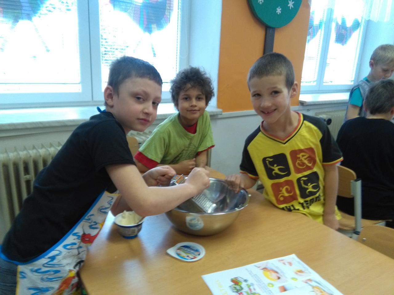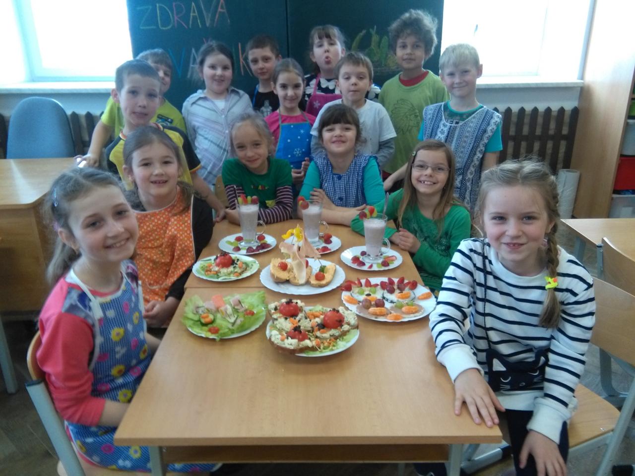 Žáci 1. a 2. ročníku s pomocí paní učitelek připravili ovocný koktejl, sladké chlebíčky, jednohubky s mrkvovou a vajíčkovou pomazánkou nebo šnečky ze šunky, sýra a pomazánkového másla.