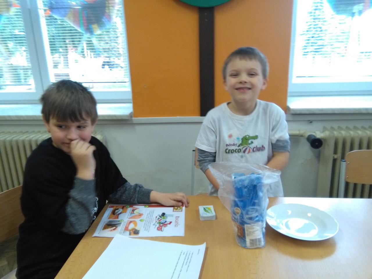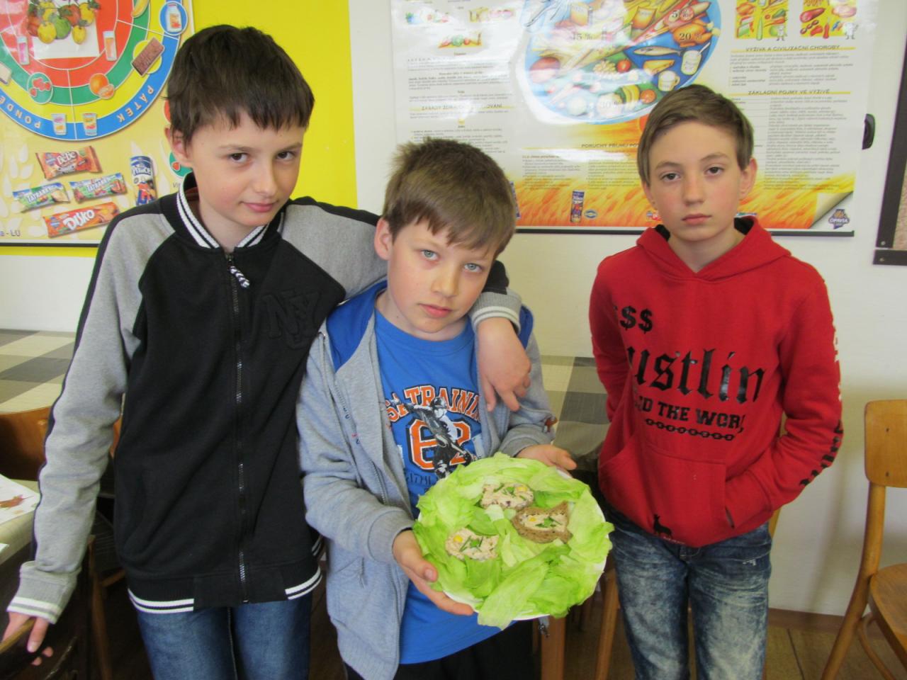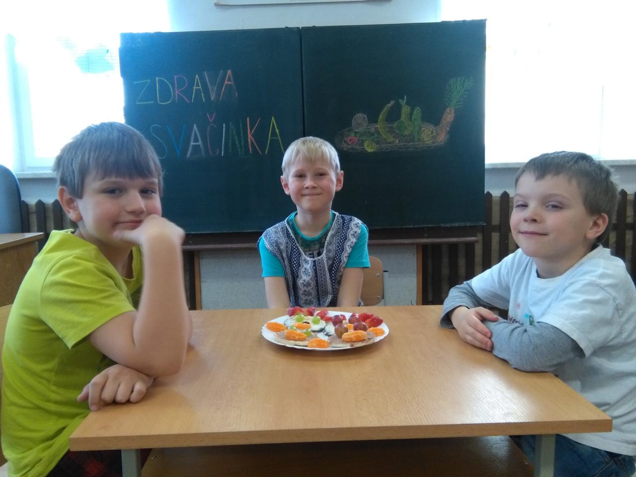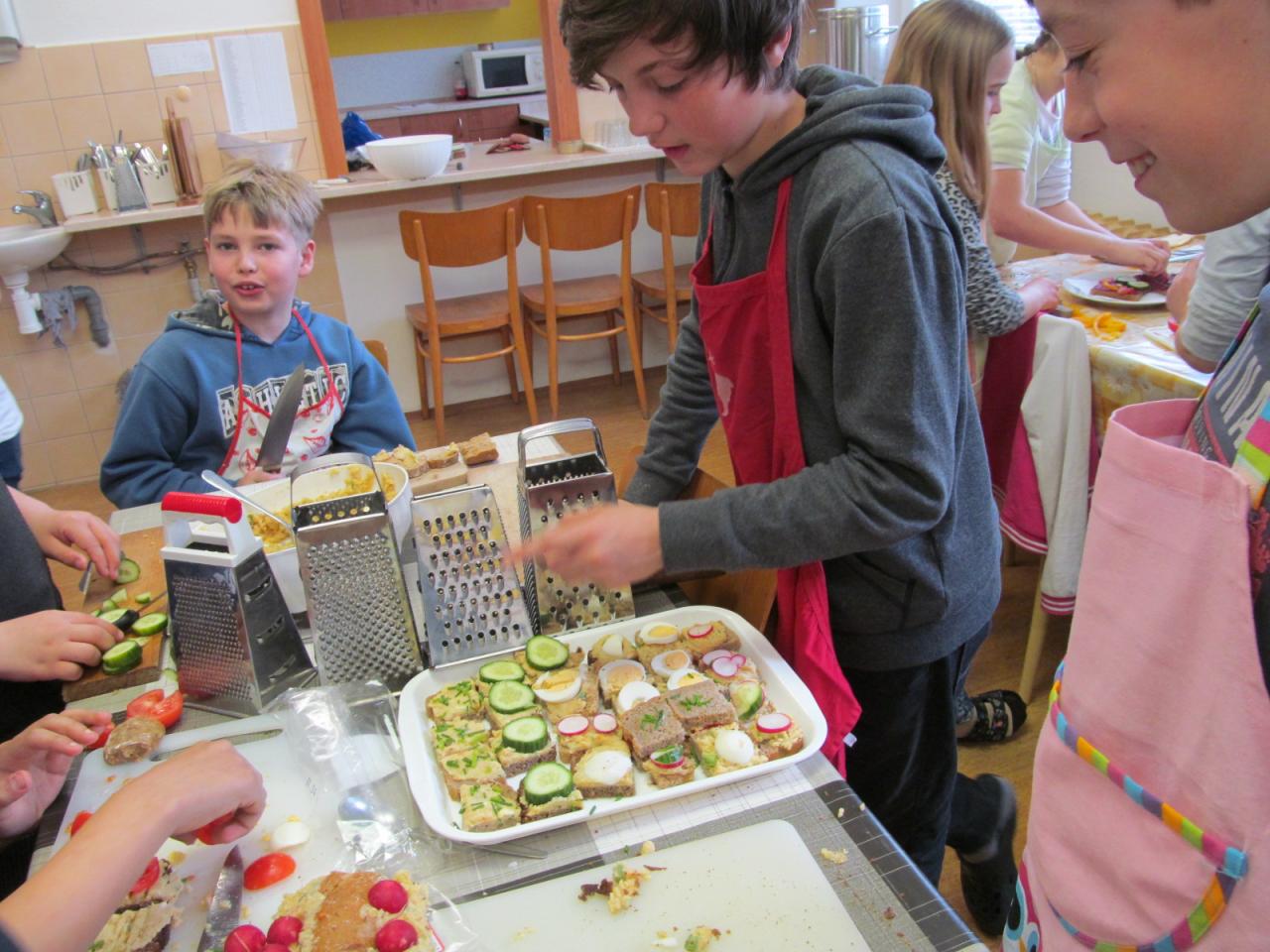 Žáci 1. a 2. ročníku s pomocí paní učitelek připravili ovocný koktejl, sladké chlebíčky, jednohubky s mrkvovou a vajíčkovou pomazánkou nebo šnečky ze šunky, sýra a pomazánkového másla.