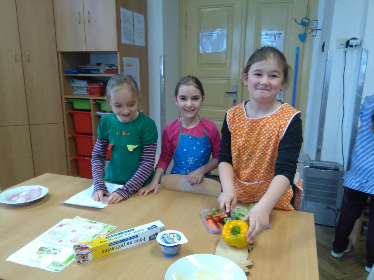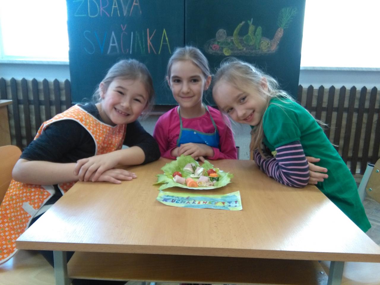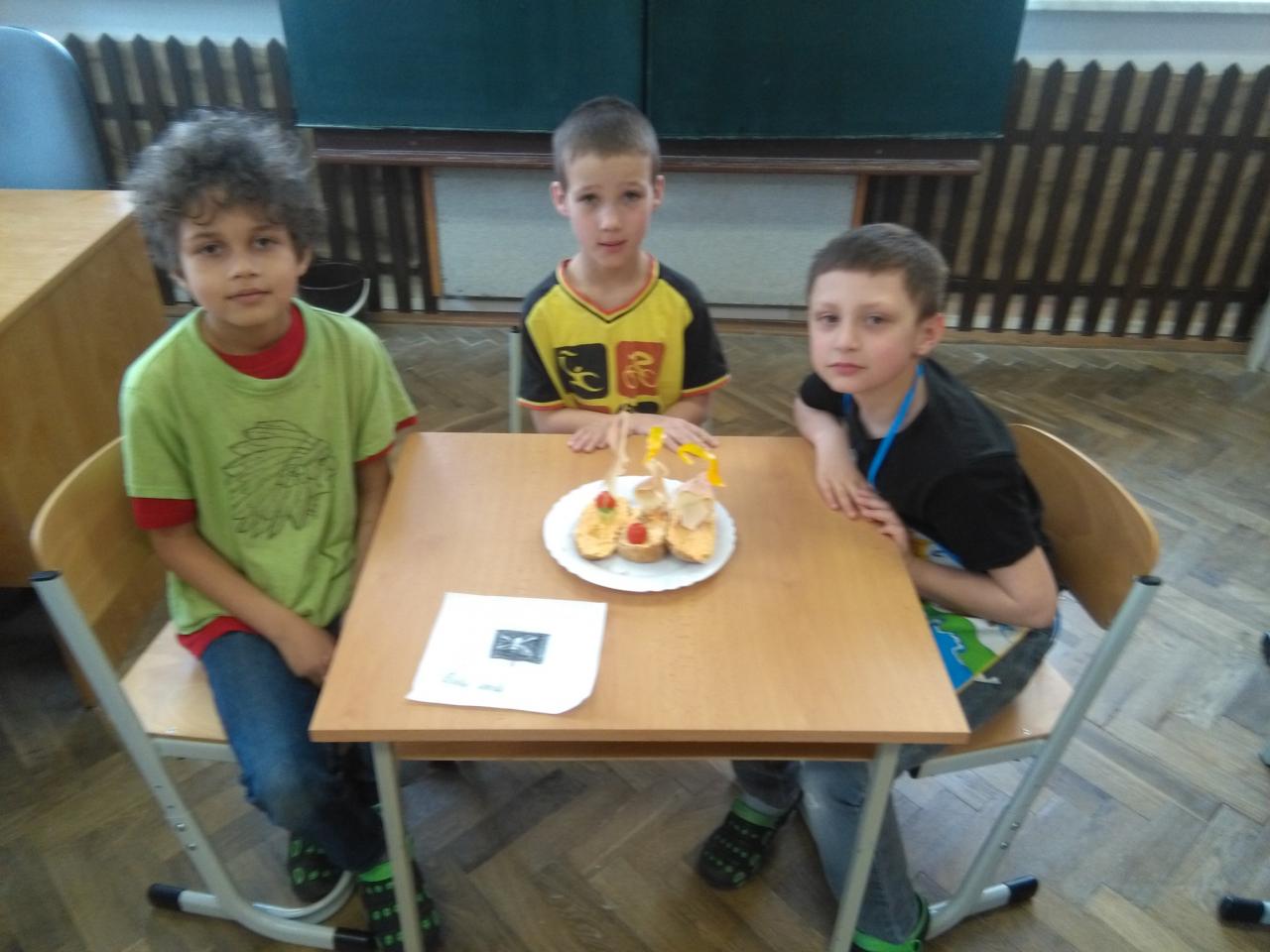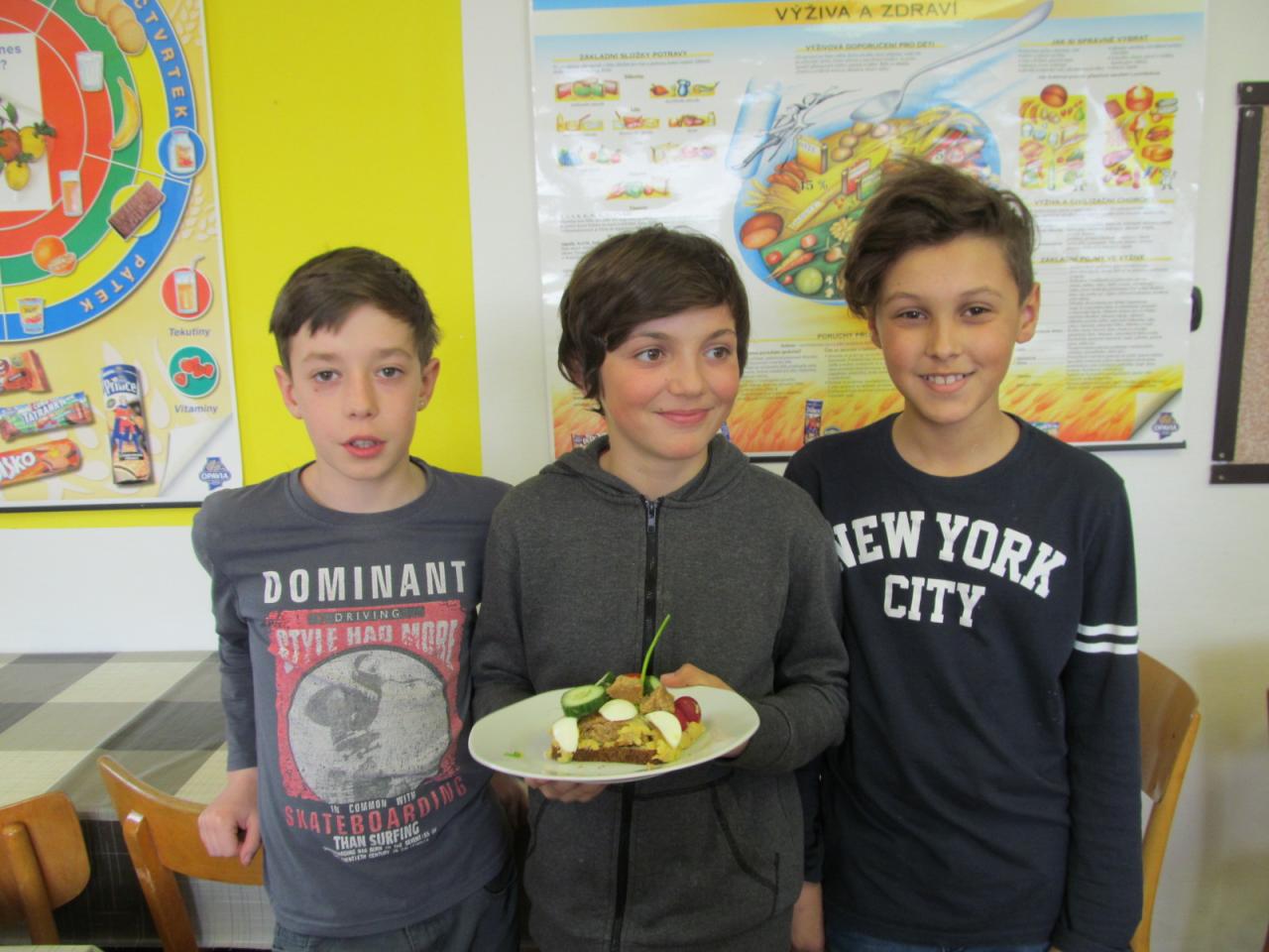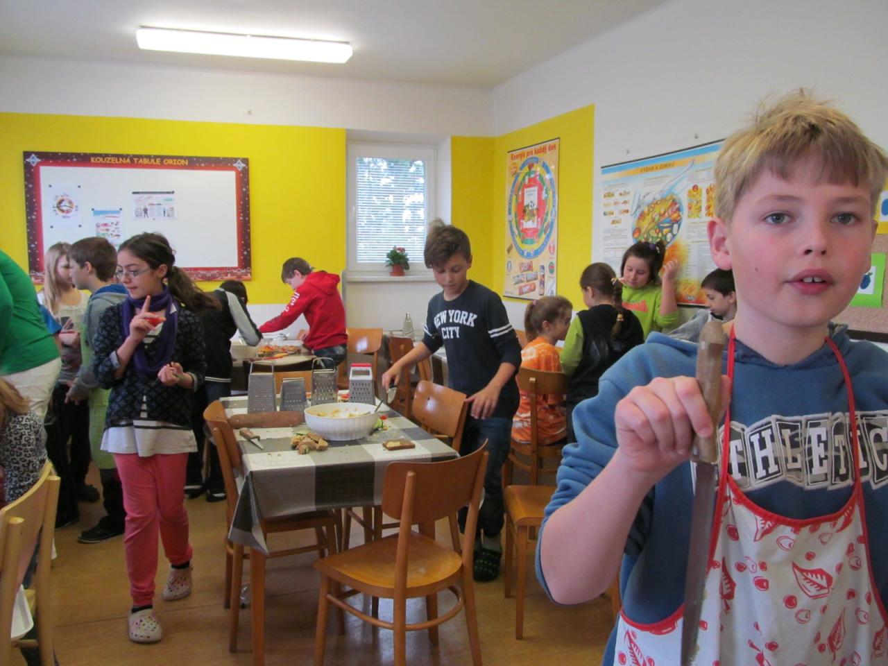 Žáci 1. a 2. ročníku s pomocí paní učitelek připravili ovocný koktejl, sladké chlebíčky, jednohubky s mrkvovou a vajíčkovou pomazánkou nebo šnečky ze šunky, sýra a pomazánkového másla.