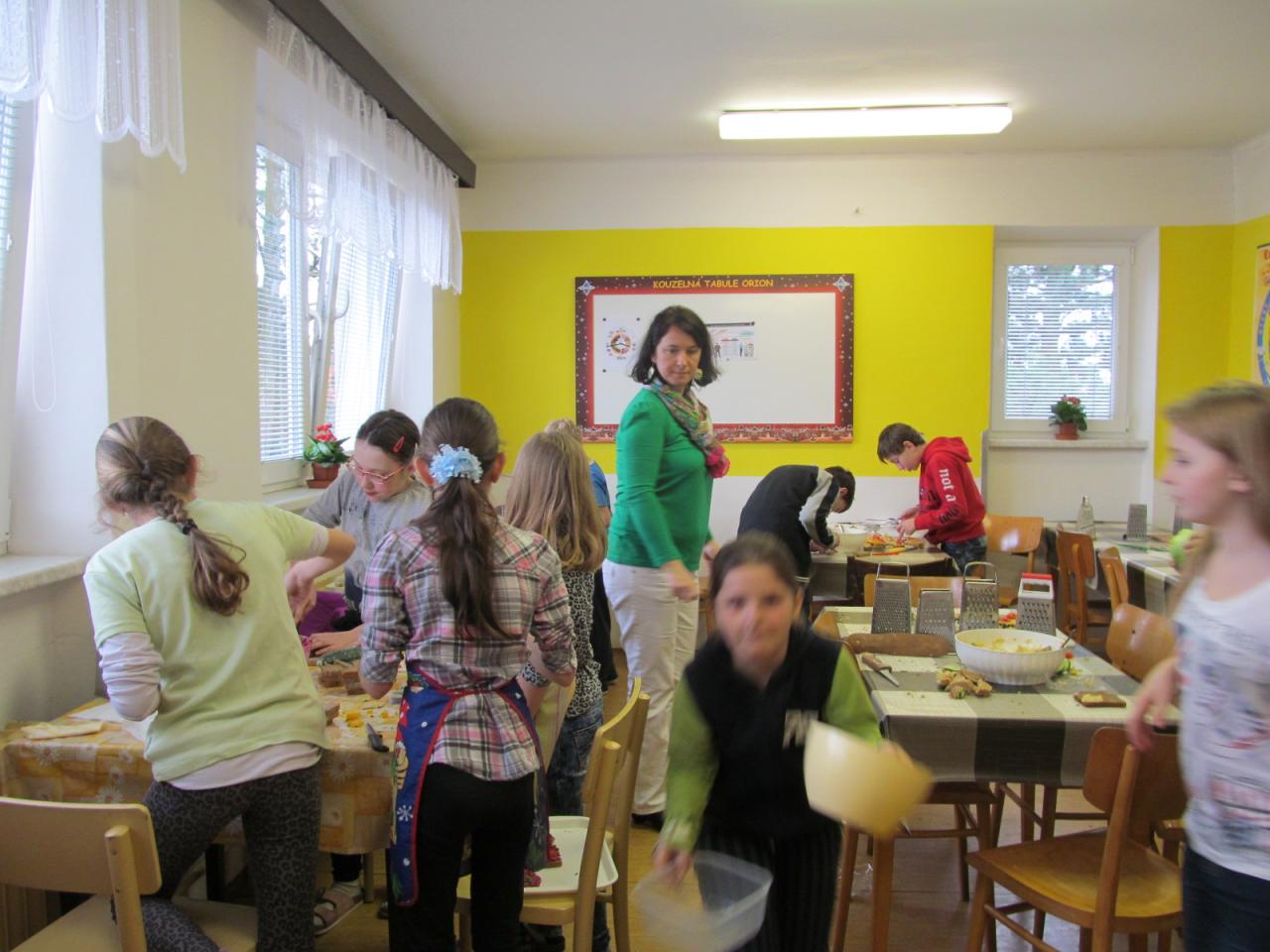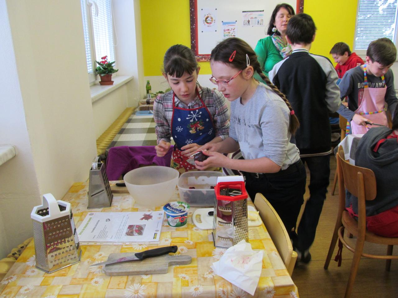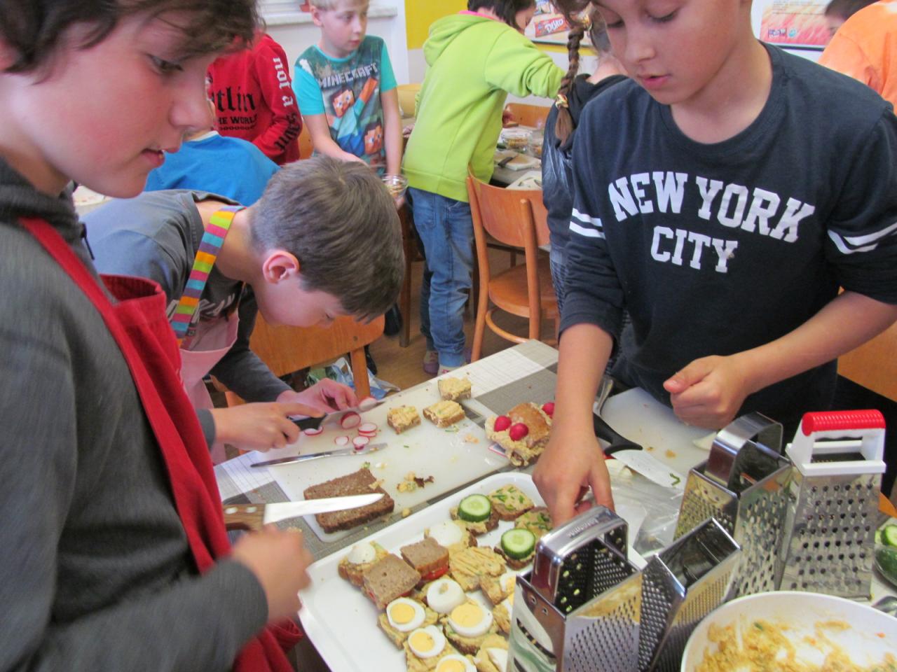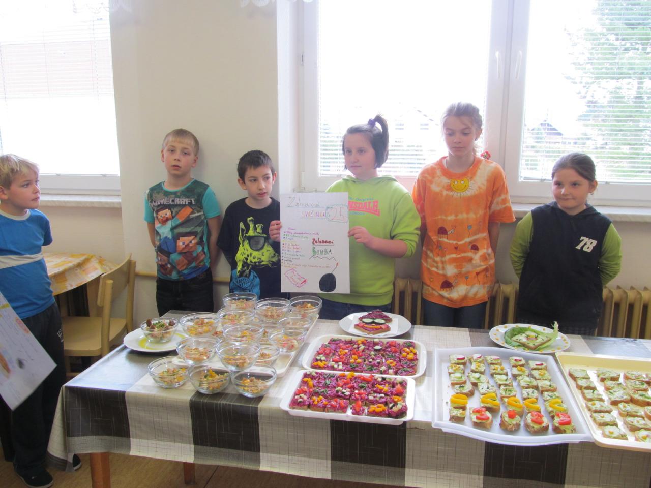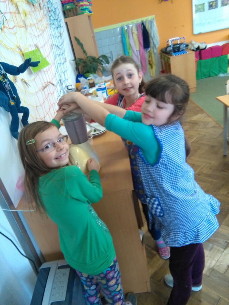 Žáci 1. a 2. ročníku s pomocí paní učitelek připravili ovocný koktejl, sladké chlebíčky, jednohubky s mrkvovou a vajíčkovou pomazánkou nebo šnečky ze šunky, sýra a pomazánkového másla.