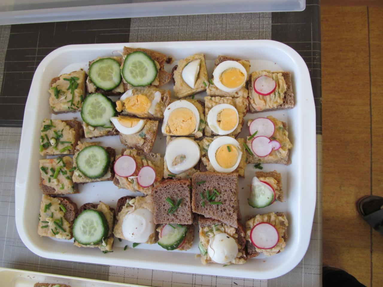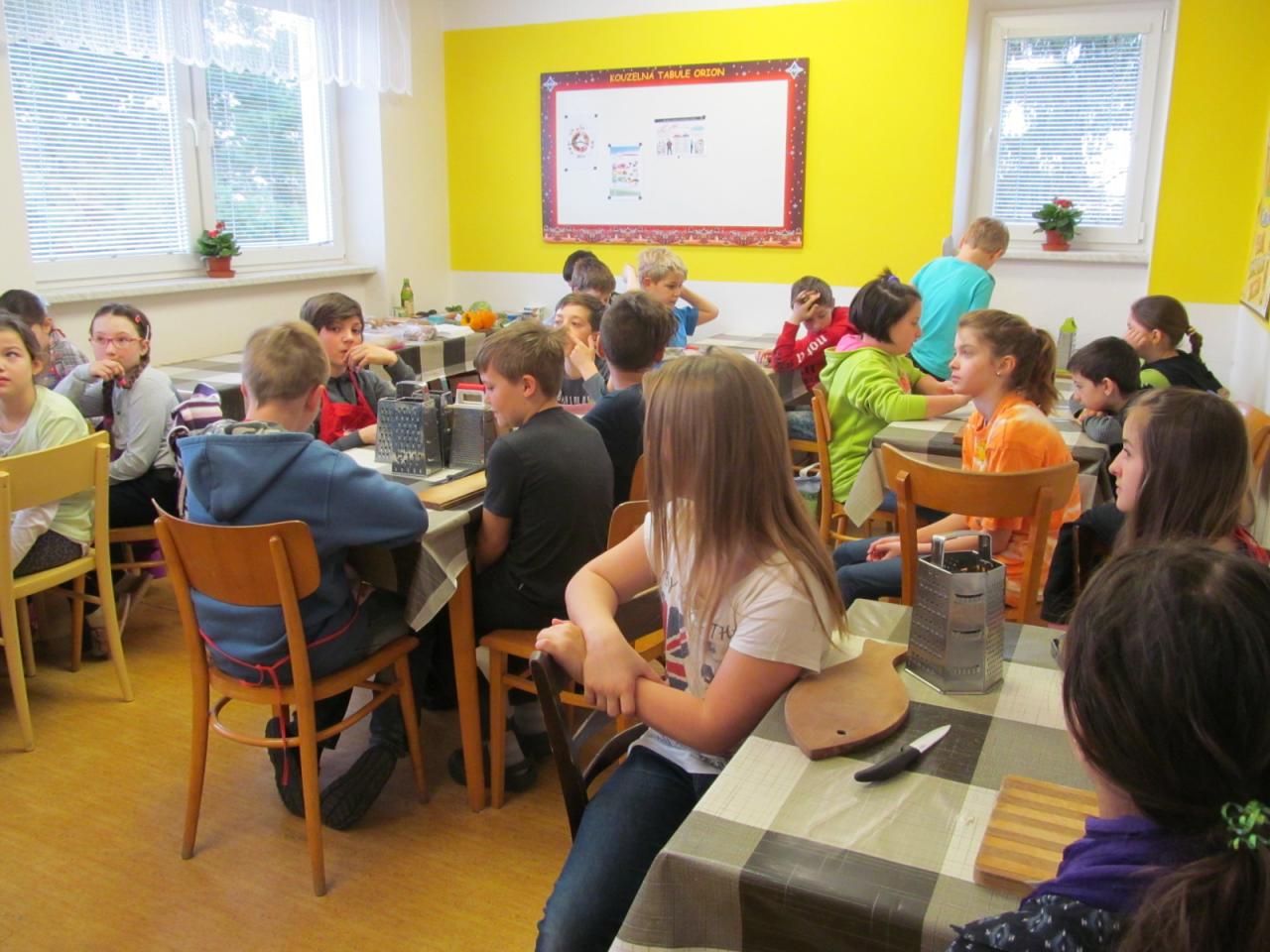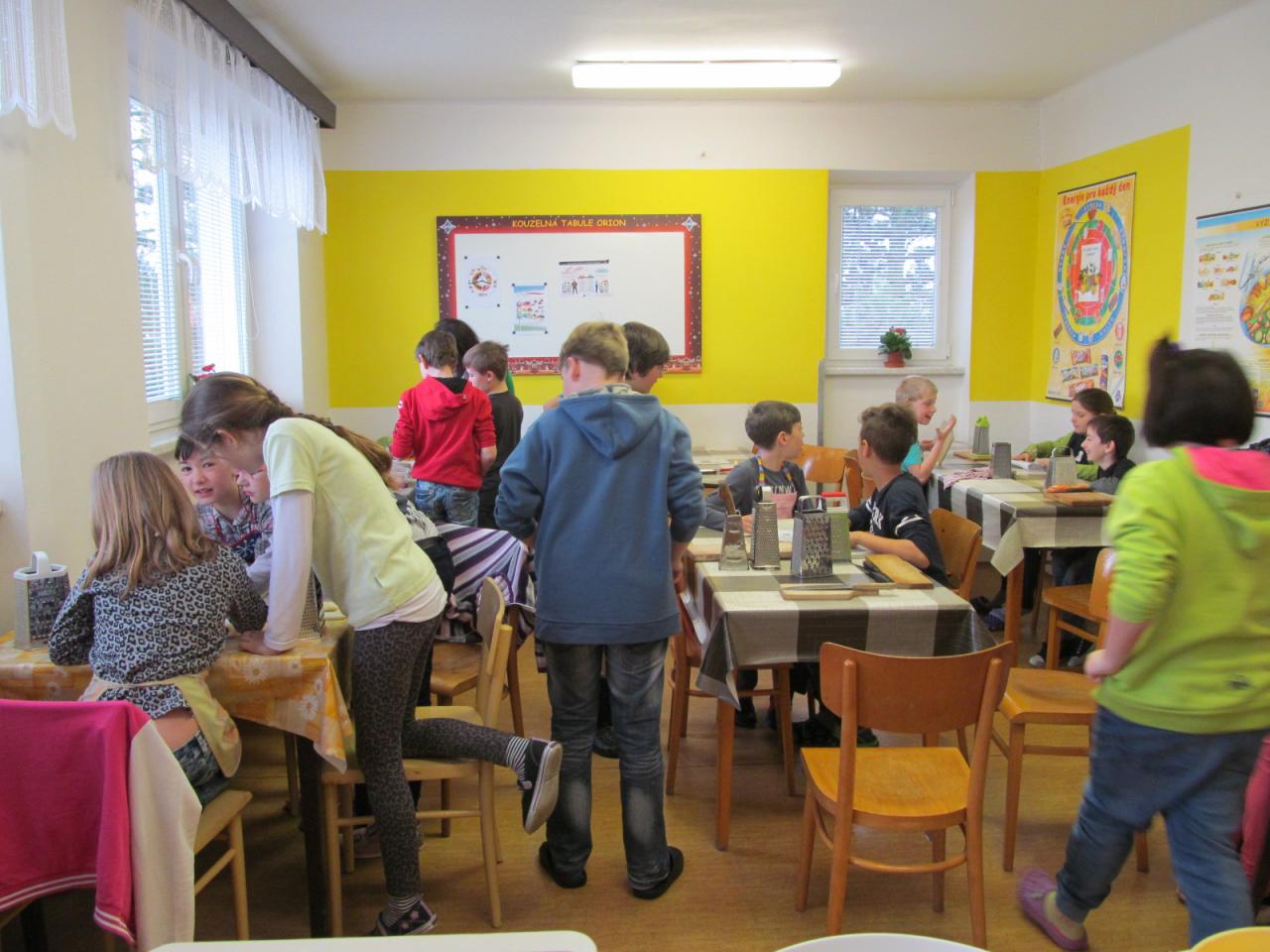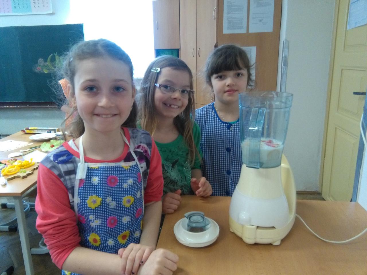 Žáci 1. a 2. ročníku s pomocí paní učitelek připravili ovocný koktejl, sladké chlebíčky, jednohubky s mrkvovou a vajíčkovou pomazánkou nebo šnečky ze šunky, sýra a pomazánkového másla.