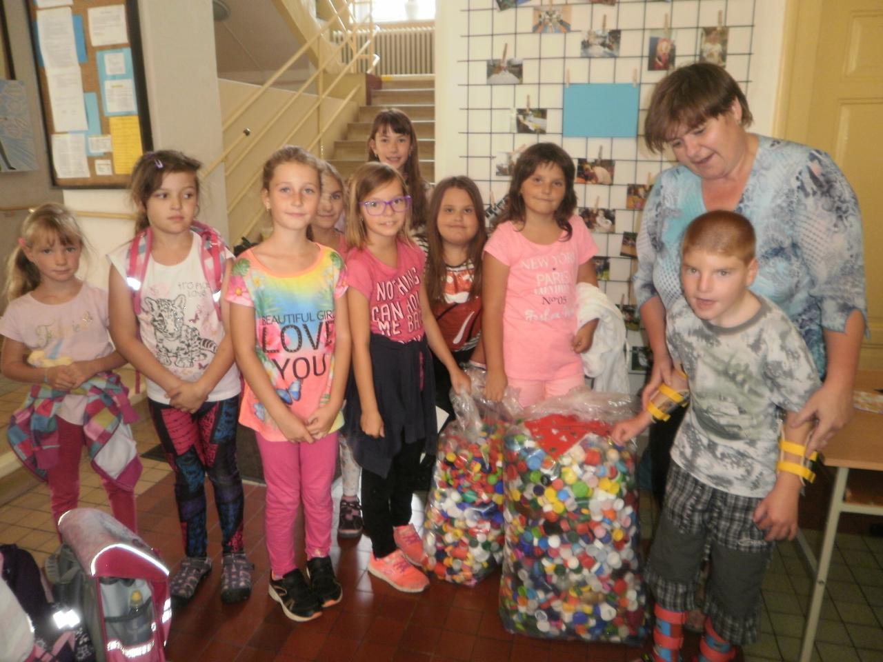 Na začátku školního roku jsme předali paní Duškové, mamince Ondry, 4 pytle plastových víček. Děkujeme všem, že víčka sbíráte a pomáháte Ondrovi přispívat na rehabilitaci.