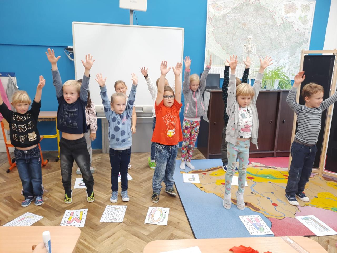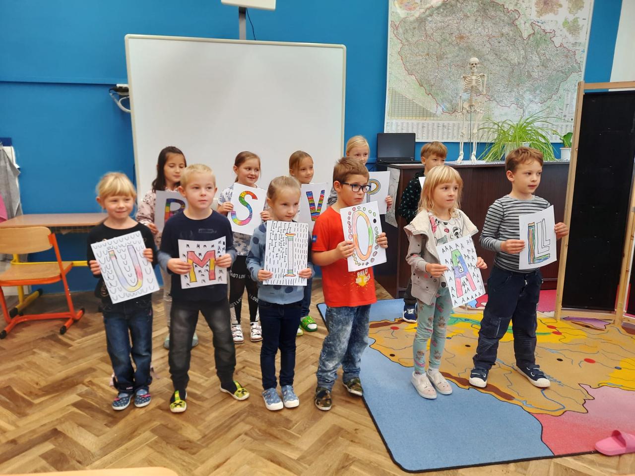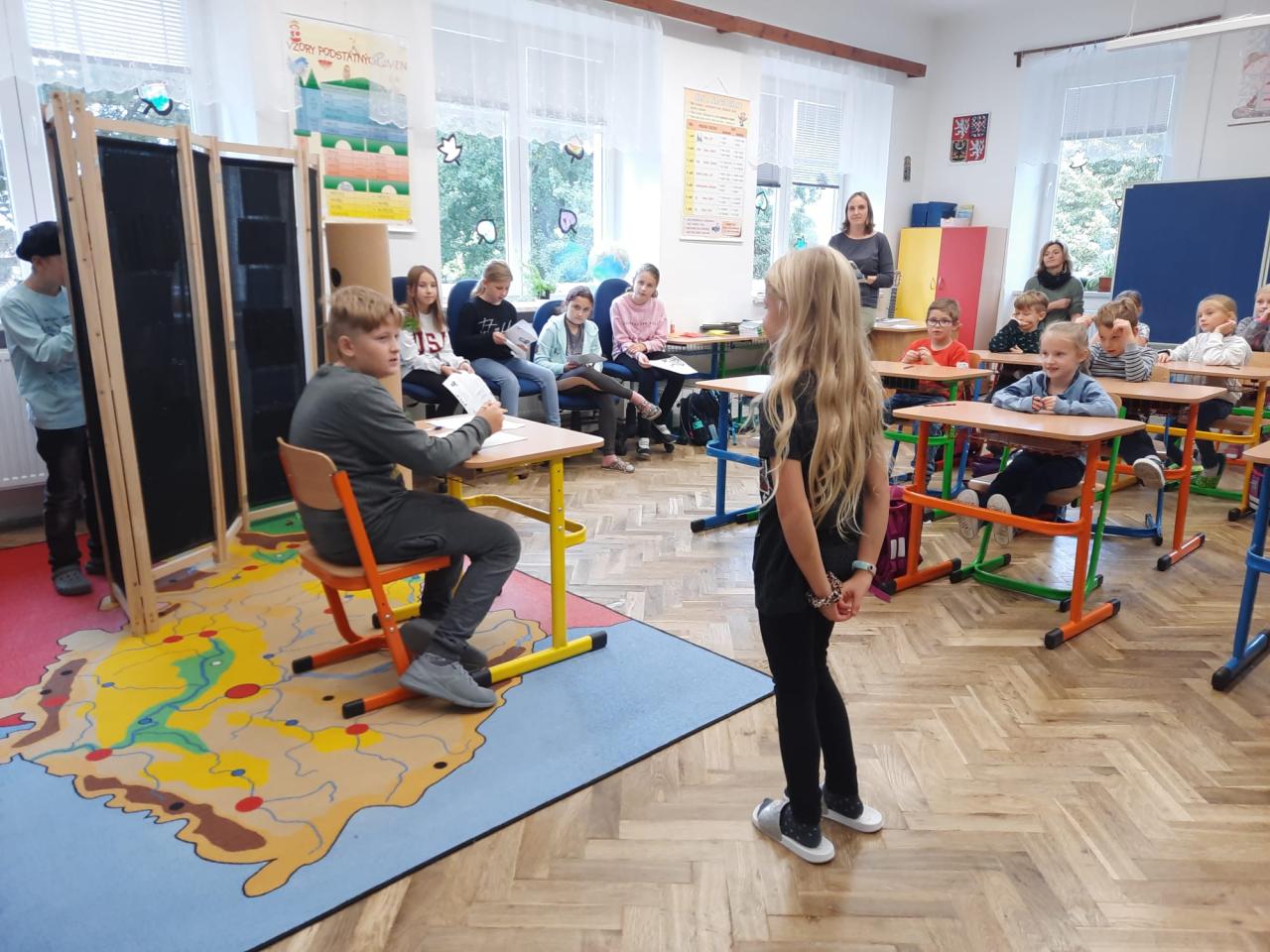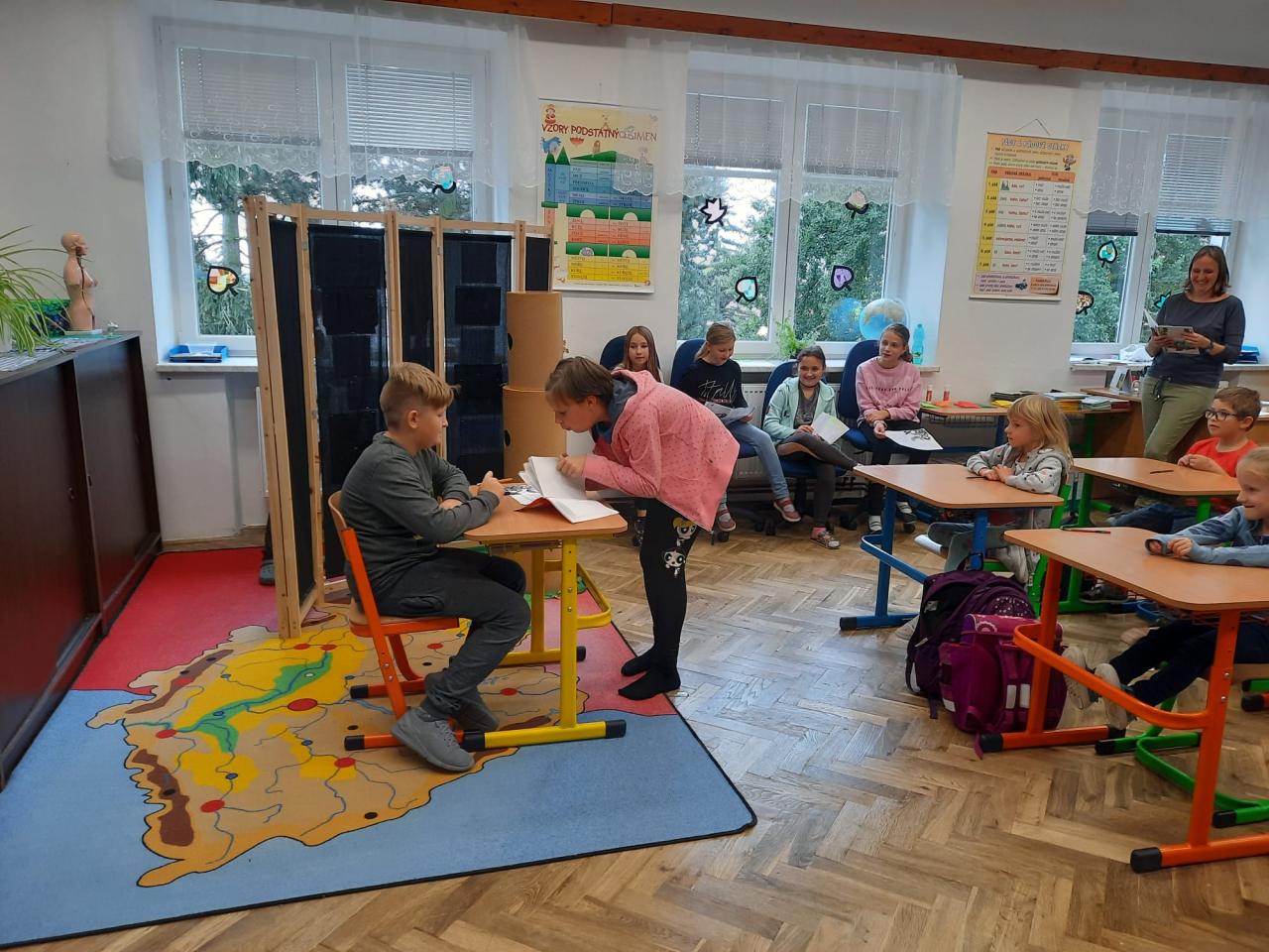 Třída starších žáků si připravila pro mladší kamarády ukázku z knihy "Jak si Slávek načaroval dubového mužíčka". Čtení a dramatizaci textu doplnili úkoly a výrobou podzimního listu a mladší žáci jim za odměnu předvedli písničku o písmencích abecedy, kterou si s paní učitelkou nacvičili.