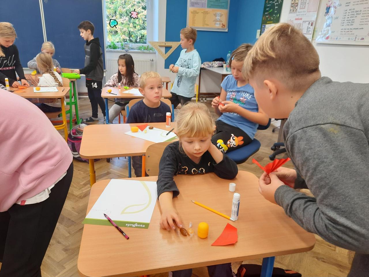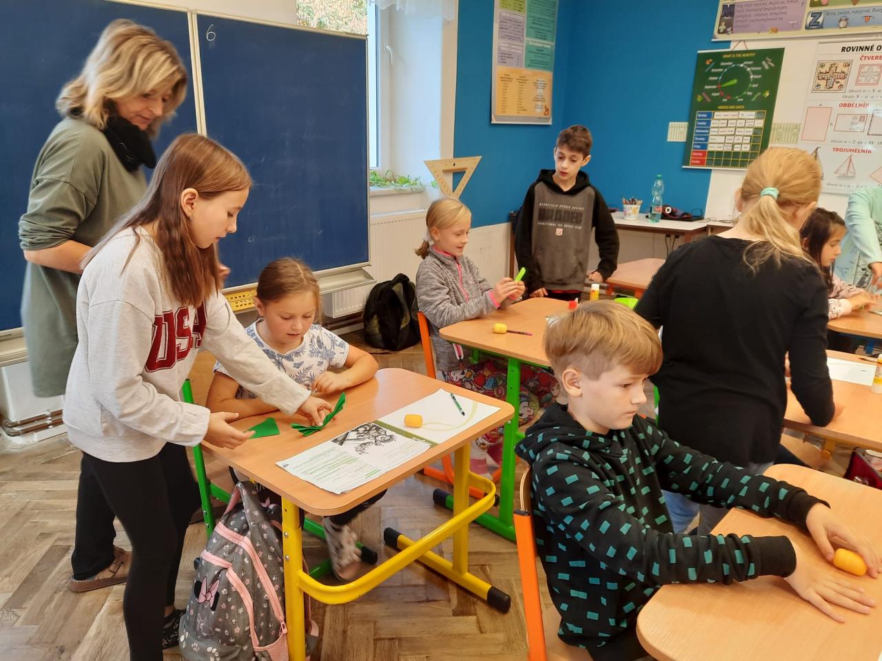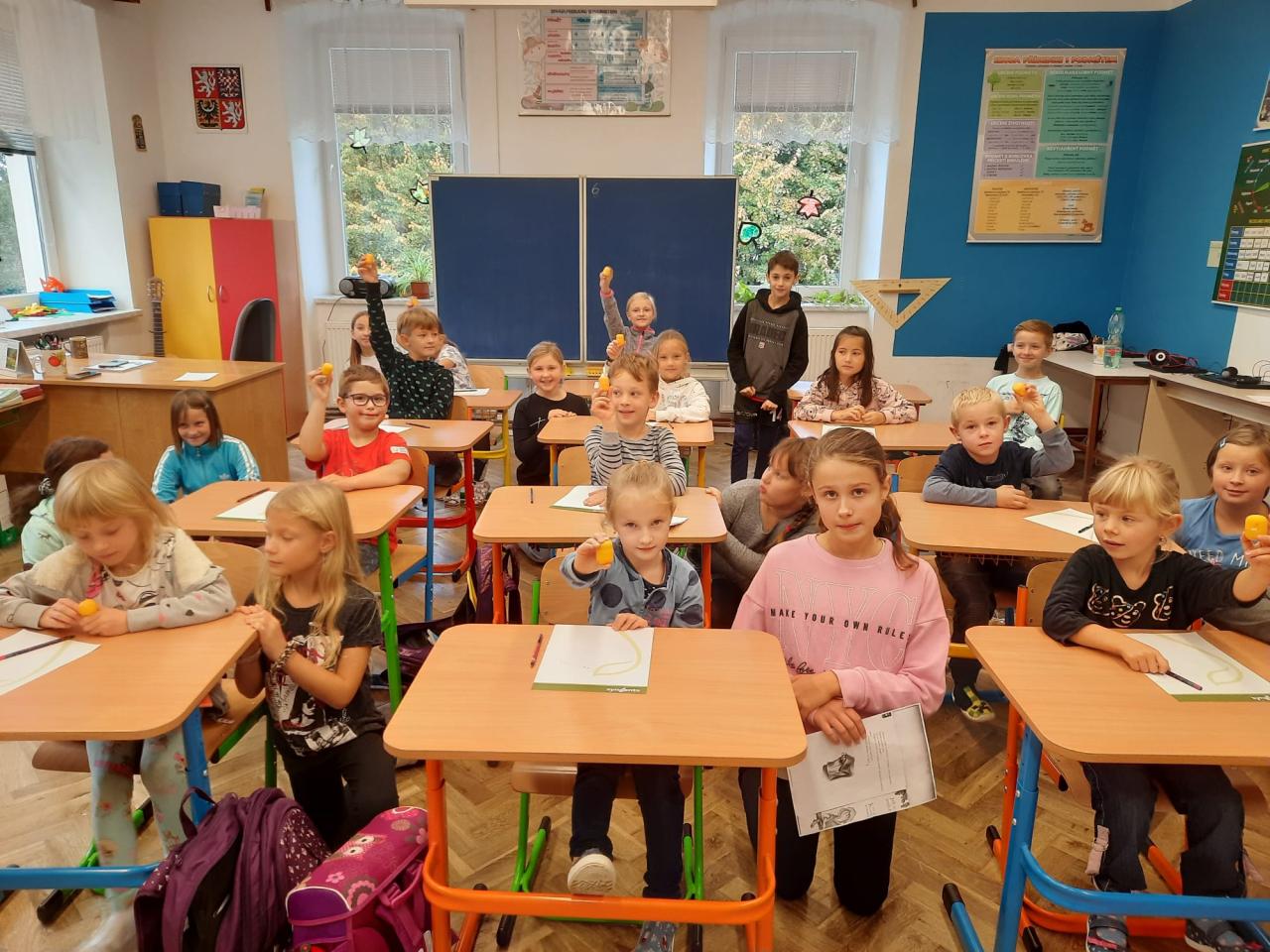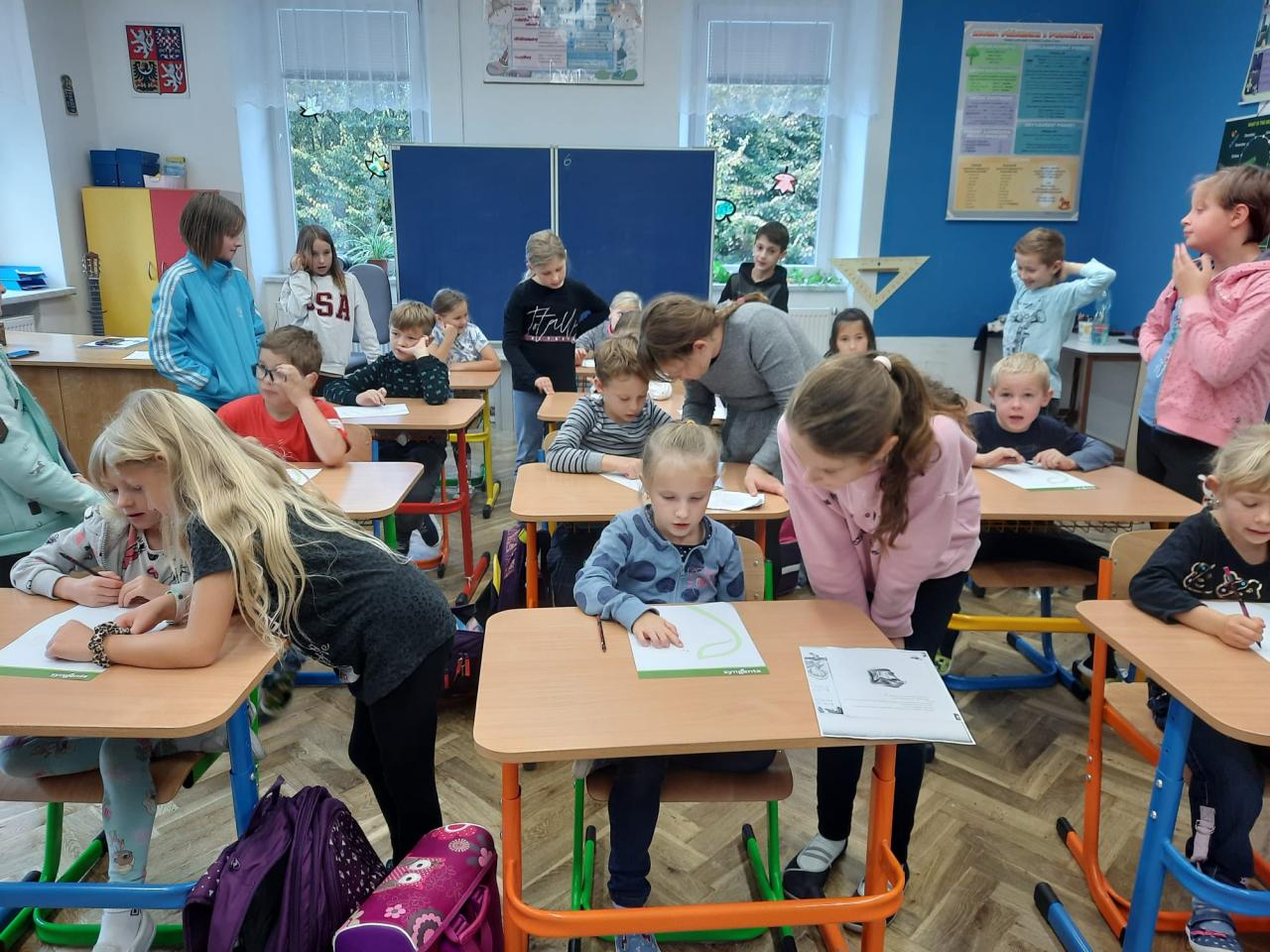 Třída starších žáků si připravila pro mladší kamarády ukázku z knihy "Jak si Slávek načaroval dubového mužíčka". Čtení a dramatizaci textu doplnili úkoly a výrobou podzimního listu a mladší žáci jim za odměnu předvedli písničku o písmencích abecedy, kterou si s paní učitelkou nacvičili.